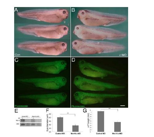Fig. 5. Knockdown of zygotic Mov10 causes decreases in eye and body size. A: Whole-mount images of Con injected tadpoles at stage 36. A total of 46 tadpoles were analyzed, all of which exhibited this normal phenotype. B: Whole-mount images of zygotic Mov10 knockdown (z-MO) tadpoles at stage 36. A total of 48 tadpoles were analyzed and 45 of them showed a small eye phenotype. C,D: Fluorescein images of the tadpoles from A and B, respectively, showing the distribution of the fluorescein-tagged morpholinos. E: RT-PCR using Mov10 primers for control and z-MO injected embryo cDNA showing effective splicing blocking and absence of Mov10 splice junction (PCR product expected size is 197 nt,+ reaction included cDNA, - reactions did not include cDNA). As a positive control, ODC (Ornithine Decarboxylase) was found to be present in both samples (PCR product expected size is 221 nt). F: Graph showing eye diameter in mm from Con injected and z-MO injected embryos measured at stage 36. A total of 67 tadpoles were analyzed. G: Graph showing overall AP length in mm from control morpholino injected and z-MO injected embryos measured at stage 36. A total of 67 tadpoles were analyzed. Error bars represent SEM, **P<0.01 (Studentâs t-test, two-tailed). Scale bar = 800 um in D. |
