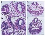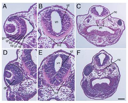 Fig. 6. Knockout of zygotic Mov10 leads to defects in the eye and brain structure. AâC: Hematoxylin and eosin staining of control morpholino injected embryos, as labeled. A: Representative section of a control eye showing distinct, well-organized layers of the retina in a control embryo, as labeled. B: Forebrain region displaying a well-developed ventricular zone and marginal zone. Note large mass of axonal fibers within the ventral marginal zone. C: Lower magnification image showing the notochord and parachordal cartilage. DâF: Hematoxylin and eosin stain of z-MO injected embryos. D: Section reveals a smaller eye with disorganized retinal layers. E: Section of the brain with a reduced marginal zone area. Note a reduced mass of axonal fibers within the ventral marginal zone. F: Lower magnification image revealing an enlarged notochord and no distinguishable parachordal cartilage. Dorsal is located toward the top of these images. bc, bipolar cell layer; dl, disorganized layers; gc, ganglion cell layer; ip, inner plexiform layer; mz, marginal zone; nc, notochord; op, outer plexiform layer; pc, parachordal cartilage; pr, photoreceptor; rp, retinal pigment epithelium; vz, ventricular zone. Scale bar in F equals 100 um (for A,B and D,E), and 170 um (for C) |