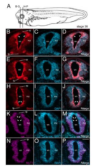 Fig. 7. Knockout of zygotic Mov10 shows abnormal staining of neuronal precursors in the ventricular zone. A: A stage 36 tadpole showing the plane of sectioning for B through P. B: Representative fluorescence image of control embryo shows the forebrain region with Sox3 positive precursors (in red) surrounding the lumen of the ventricle. Note the expanded dorsal Sox3 labeling in the ventricular zone, denoted by white arrowheads. C: DAPI staining (in blue) of the same section shown in B. D: Merged images from B and C. EâG: Representative fluorescence images from a similar region, as shown in B, from representative z-MO injected tadpoles. E: Sox3 positive neuronal precursor cells are located in the ventricular zone. F: DAPI staining of the same section shown in E. G: Merged images from E and F. Notice the enhanced overall staining of Sox3, including in the more ventral regions of the ventricular zone, denoted by white arrowheads (compare with the control embryo shown in B). HâJ: More posterior section from the forebrain region of a z-MO injected tadpole. H: Sox3 neuronal precursors. Note the expanded ventral labeling denoted by arrowheads. I: Corresponding DAPI staining for H. J: Merge of Sox3 and DAPI stains. KâM: MyT1 staining for differentiated neurons in a control embryo. K: MyT1 positive differentiated neurons. Note expanded dorsal area devoid of MyT1 expression within the ventricular zone (denoted by white arrowheads). L: DAPI staining of the same section shown in K. M: Merged images from K and L. NâP: Representative sections from a z-MO injected tadpoles. N: Wide distribution of MyT1 positive differentiated neurons. Note uniform MyT1 staining in the dorsal ventricular zone (compare with K). O: DAPI staining of the same section shown in N. P: Merged images from N and O. fp, floor plate; mz, marginal zone; rp, roof plate; vn, ventricle. Scale bar = 40 mm in P. |