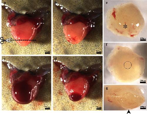 Fig. 1. Apical resection of the X. tropicalis heart and rapid blood coagulation after resection. a The heart was exposed for apical resection. The dash line shows the resection plane, corresponding to approximately 10% of the ventricle. b The heart immediate after surgical amputation. c Bleeding after ventricle amputation. d Rapid blood coagulation in the amputated heart after approximately 5 s of pressure with sterile cotton. e Outer surface of the amputated apex. The asterisk indicates the end of the apex on the outer surface. f Inner surface of the amputated apex. The circle with the dotted line indicates the bottom of the ventricle. g Lateral view of the amputated apex. The arrow indicates the bottom of the apex on the outer surface