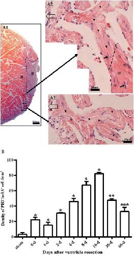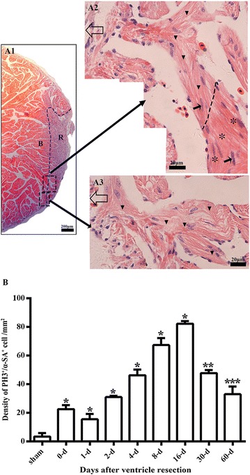 Fig. 5. α-SA/PH3 positive cells exist in the border area of the amputated site and regenerated area. a1 Longitudinal section of the apical area from a sham control. High magnification of the square region is shown (a2). Longitudinal sections of an amputated heart at 0 daar (b1, b2), 1 daar (c1, c2), 2 daar (d1, d2), 4 daar (e1, e2), 8 daar (f1, f2), 16 daar (g1, g2), 30 daar (h1, h2; perfect regeneration), 30 daar (i1, i2; nearly perfect regeneration), and 60 daar (j1; perfect regeneration). The amputated apex was regenerated by newly cardiomyocytes within approximately 30 days after amputation, as demonstrated by the presence of many α-SA+ cardiomyocytes in the regenerated zone (area between the red dotted line and white dotted line). In addition, the density of α-SA+/PH3+ cardiac myocytes in the border area of the regenerated zone at 2â8 daar and in the regenerated zone at 16â30 daar is significantly higher than those in the sham control and in 0â2 daar groups, suggesting that the proliferation of endogenous cardiomyocytes in the border area of the amputated site might be an important mechanism for regeneration of the damaged myocardium. α-SA alpha skeletal muscle actin, PH3 phospho-histone H3, DAPI 4â²,6-diamidino-2-phenylindole. White arrow: PH3+ nucleus. White dotted line, outer surface of the epicardium. Area between the red dotted line and white dotted line, regenerated area after amputation. 30-daar-n: amputated heart with nearly perfect regeneration at 30 daar. Bar in a1âj1 = 50 μm. Bar in a2âj2 = 10 μm. Six frogs were inspected for 30 and 60 daar, while three frogs were inspected for other time points respectively
