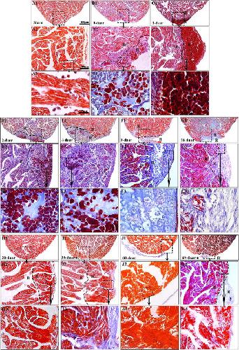 Fig. 7. The regeneration of the injured adult X. tropicalis heart is nearly scar-free manner. a1 Longitudinal section of an adult heart from a sham control. Bar = 400 μm (scale bar for a1âk1). a2 High magnification of the rectangle with a dotted line from a1. Bar = 100 μm (scale bar for A2âK2). A3 High magnification of rectangle with the dotted line from A2. Bar = 20 μm (scale bar for a3âk3). Longitudinal sections from amputated heart at 0 daar (B1âB3), 1 daar (C1âC3), 2 daar (D1âD3), 4 daar (E1âE3), 8 daar (F1âF3), 16 daar (G1âG3), 30 daar (H1âH3; an amputated heart regenerated with a perfect morphology), 30 daar (i1âi3; an amputated heart regenerated with a nearly perfect morphology), 60 daar (J1âJ3; an amputated heart regenerated with a perfect morphology) and 60 daar (K1âK3; an amputated heart regenerated with a nearly perfect morphology). Fibrosis-like structures were stained in blue. In the hearts that were regenerated with a nearly perfect morphology, fibrosis-like structures was only observed in adhesion tissue, but not in the regenerated myocardium between 30 and 60 daar. B border area. R regenerated area. Six frogs were inspected for 30 and 60 daar, while three frogs were inspected for other time points respectively