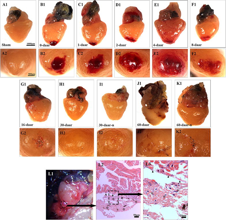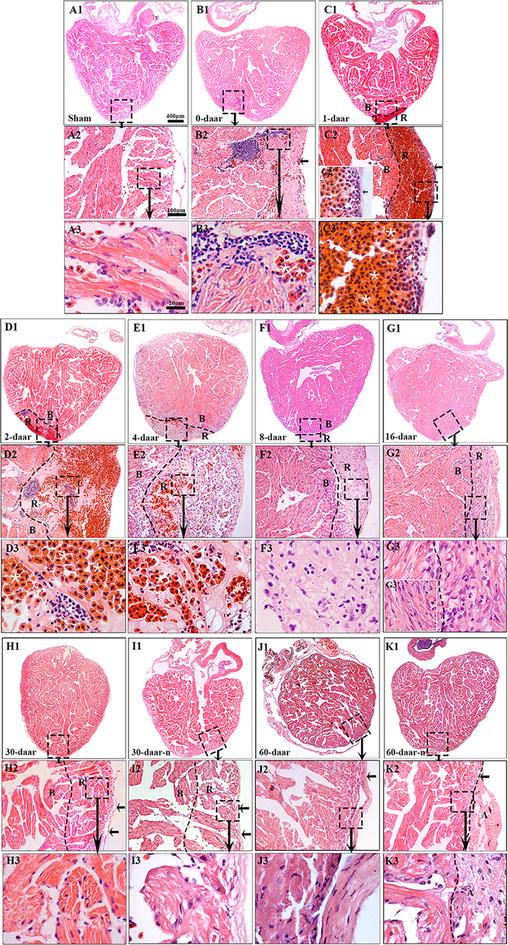 Fig. 3. Adult X. tropicalis heart has capacity for regeneration after resection. A1 Longitudinal section of an adult heart from the non-amputated sham control. Bar = 400 μm. A2 High magnification of the region outlined by rectangle in A1. Bar = 100 μm. A3 High magnification of the rectangle region in A2. Bar = 20 μm. B1âB3 An amputated heart at 0 daar (approximately 30 min after amputation), showing activated inflammation and hyperemia at the border of the injury. C1âC3 An amputated heart at 1 daar, showing a membrane-like structure (arrow) close to the outer surface of the scar tissue which exhibited with inflammatory cell infiltration, and red blood cells accumulation below the membrane-like structure. C2â² High power of the membrane-like structure which is consisted of cellular or some extracellular matrix. D1âD3 An amputated heart at 2 daar, showing more inflammatory cells in the regenerated area compared with 1 daar. E1âE3 An amputated heart at 4 daar, showing an increase of inflammatory cells and a decrease of red blood cells in the regenerated area compared with 2 daar. F1âF3 An amputated heart at 8 daar, showing the disappearance of most infiltrated red blood cells and a significant decrease of the inflammatory cell intensity in the regenerated area. g1âg3 Most of the fibrous tissue production was replaced with newly regenerated cardiomyocytes and some of the newly regenerated cardiac myocytes are matured, as indicated by a more regular cardiac-specific cross-striated morphology at 16 daar (G3â²). H1âH3, I1âI3 An amputated heart regenerated with a perfect morphology and nearly perfect morphology at 30 daar. The amputated area was regenerated with mature cardiomyocytes. In addition, the regenerated myocardium has an intact epicardium (arrow). J1âJ3, K1âK3 An amputated heart regenerated with a perfect morphology and nearly perfect morphology at 60 daar. The amputated area was regenerated with mature cardiomyocytes. An intact epicardial structure (arrow) in the regenerated myocardium. R regenerated area, B border area. White star: showing red blood cells; White arrows: showing inflammation cells. Six frogs were inspected for 30 and 60 daar, while three frogs were inspected for other time points respectively