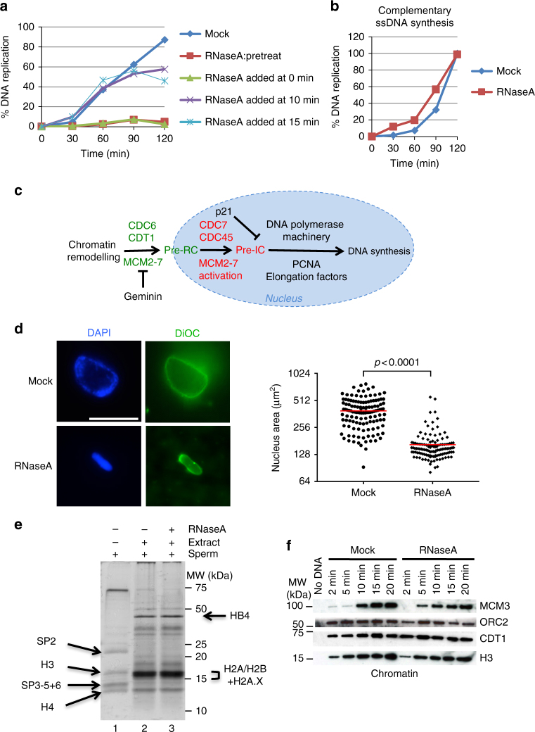 Upon fertilisation, the sperm pronucleus acquires the competence to replicate the genome through a cascade of events that link chromatin remodelling to nuclear envelope formation. The factors involved have been partially identified and are poorly characterised. Here, using Xenopus laevis egg extracts we show that RNAs are required for proper nuclear envelope assembly following sperm DNA decondensation. Although chromatin remodelling and pre-replication complex formation occur normally, RNA-depleted extracts show a defect in pre-RC activation. The nuclear processes affected by RNA-depletion included ELYS recruitment, which accounts for the deficiency in nuclear pore complex assembly. This results in failure in chromatin relaxation as well as in the import and proper nuclear concentration of the S-phase kinases necessary for DNA replication activation. Our results highlight a translation-independent RNA function necessary for the parental genome progression towards the early embryonic cell cycle programme.