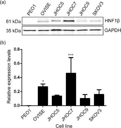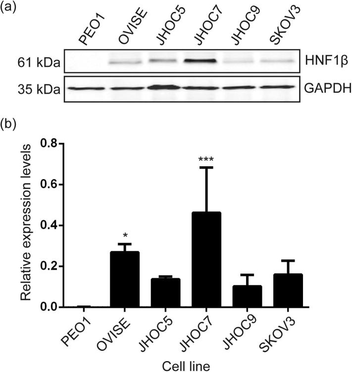 Fig. 1. (A) HNF1β protein expression levels in CCC cell lines OVISE, JHOC5, JHOC7, JHOC9, SKOV3 and a negative control HGSOC cell line, PEO1; (B) Data is the mean (n = 3, three biological replicates) and SEM. Expression levels were normalised to the housekeeping protein GAPDH. The expression levels observed with JHOC5 (P < 0.005, ∗∗∗) and OVISE (P < 0.05, ∗) cells were significantly higher than PEO1.