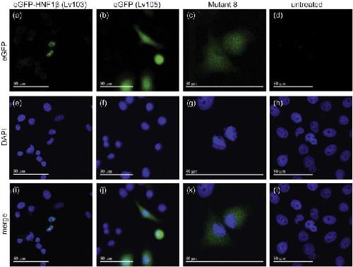 Fig. 2. eGFP imaging of PEO1 transduced lines with (a) eGFP-HNF1β (Lv103) showed primarily nuclear localisation of the GFP signal, whereas cells transduced with eGFP (Lv105) alone (b) showed both nuclear and cytoplasmic localisation. In cells transduced with eGFP-HNF1β (Lv103) in which the seven-residue NLS had been deleted (c, Mutant 8) the eGFP signal was mislocalized to the cytoplasm. The scale bar represents 80 μm. Images were taken on a Leica tandem confocal microscope using 20Ã, 40à and 60à objectives.