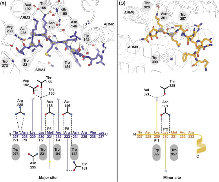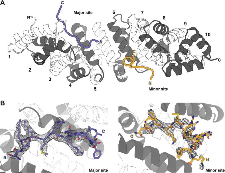 Fig. 5. (A) Overview of the 2.4 Å crystal structure of the ΔIBB mouse Importin-α1:HNF1βNLS complex. Two copies of the NLS peptide were observed where one was bound in the major site (blue) and another in the minor site (yellow). Each ARM repeat of mouse Importin-α1 has been labelled with alternating colours. (B) Final 2Fo-Fc electron density map around NLS peptide in major and minor binding sites on mouse Importin-α1 contoured at 1σ.