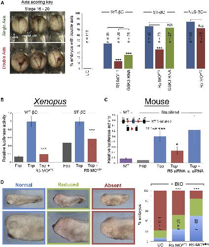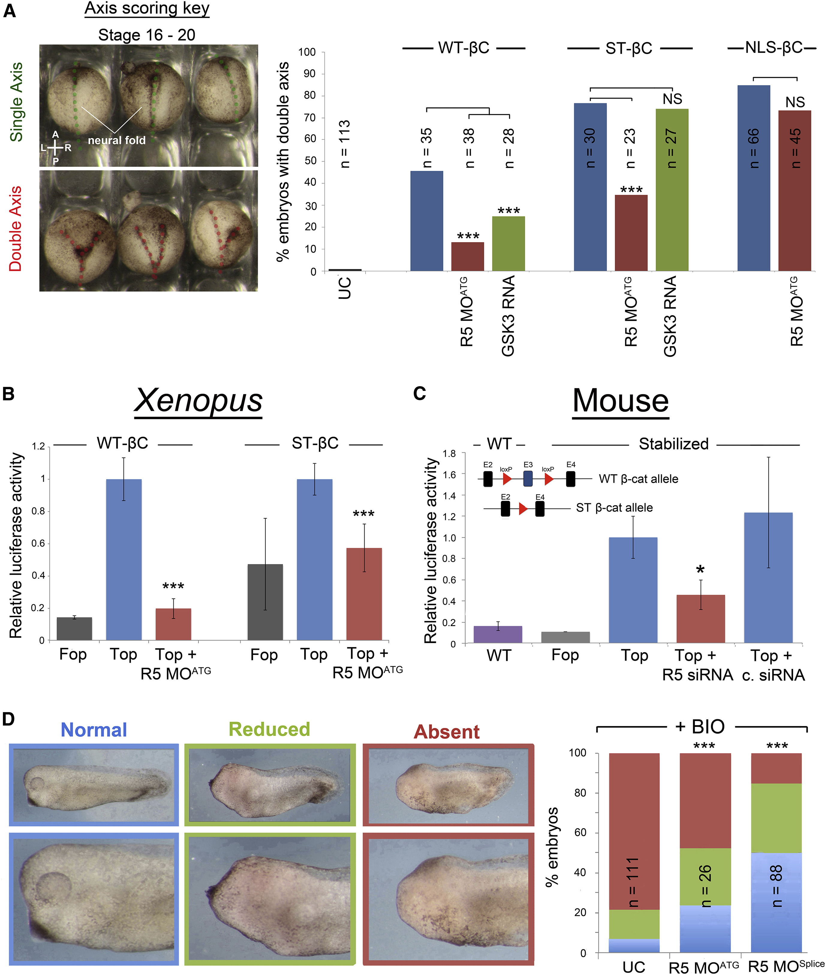 Figure 3. Rapgef5 Acts Downstream of β-Catenin Cytoplasmic Stabilization (A) The ability to induce secondary axes in development can be used as a readout of Wnt signaling activity. Uninjected embryos have a single axis (dotted green line), while embryos injected with β-catenin mRNA can have a second embryonic axis (two dotted red lines), which are readily detected in stages 16â19 embryos. Injection of WT, ST, or NLS-tagged β-catenin can induce secondary axes. Rapgef5 depletion significantly decreases the percentage of secondary axes induced by WT and ST β-catenin. Injection of GSK3 mRNA reduces secondary axes induced by WT β-catenin but has no effect on ST β-catenin. The ability of NLS-β-catenin to induce secondary axes is unaffected by reduction of Rapgef5 levels. (B) Rapgef5 knockdown reduces luciferase activity in embryos injected with WT or ST β-catenin mRNA in a TOPFlash assay. Data are represented as mean ± SD. (C) Wnt signaling activity is reduced in ST β-catenin murine embryonic fibroblasts (δexon3) following siRNA depletion of Rapgef5. The schematic depicts the Catnblox(ex3) mouse allele. Exon 3 (E3), containing the GSK3 phosphorylation sites that target β-catenin for cytoplasmic degradation, is flanked by loxP sites allowing for its conditional removal and production of a ST β-catenin allele. WT, WT cells; Fop, ST β-catenin cells transfected with FOPFlash-negative control; Top, ST β-catenin cells transfected with TOPFlash reporter plasmid; Top + R5 siRNA, ST β-catenin cells transfected with Rapgef5 siRNA and TOPFlash reporter plasmid; Top + C siRNA, ST β-catenin cells transfected with control siRNA and TOPFlash reporter plasmid. A Renilla luciferase transfection control was included in each treatment to allow normalization. Data are represented as mean ± SEM. (D) Pharmacological inhibition of GSK3 by the addition of BIO between stages 9 and 11 results in increased β-catenin signaling and loss of anterior development in Xenopus embryos. Depletion of Rapgef5 can counteract this effect and rescue development of the head, demonstrating that Rapgef5 regulates Wnt signaling downstream of GSK3. âp < 0.05, âââp < 0.005. |