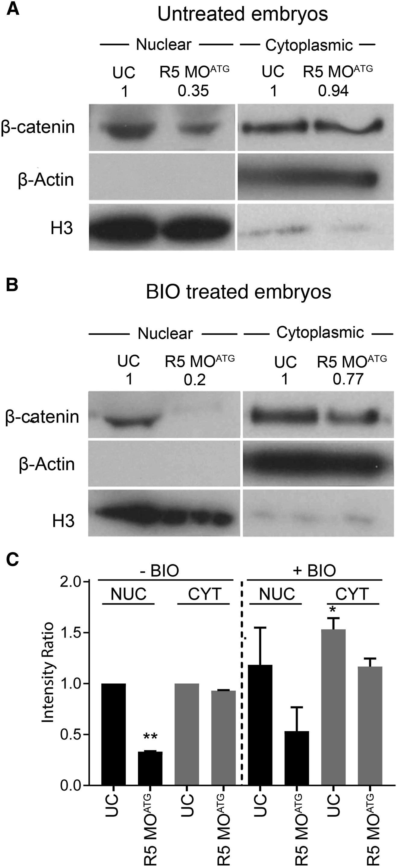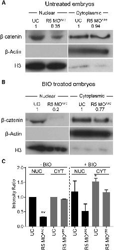 Figure 6. Depletion of Rapgef5 Impairs Nuclear Translocation of Endogenous β-Catenin (A) Nuclear/cytoplasmic fractionation reveals that levels of endogenous β-catenin are reduced in the nuclei of Rapgef5 morphants, while cytoplasmic levels are essentially normal. (B) BIO treatment does not rescue the nuclear localization of endogenous β-catenin. (C) Quantification of average β-catenin levels in nuclear and cytoplasmic fractions of control and morphant embryos with or without BIO treatment (error bars represent SEM). All nuclear treatments (black bars) are relativized to the BIO-untreated nuclear control, and all cytoplasmic treatments (gray bars) are relativized to the BIO-untreated cytoplasmic control. Note the reduction of nuclear-localized β-catenin in Rapgef5-depleted embryos with or without BIO treatment. The BIO-treated rapgef5 morphants have less nuclear-localized β-catenin than BIO-untreated controls (UCs), despite having higher levels of cytoplasmic β-catenin. The cellular compartment markers (H3 for nuclear fraction and β-actin for cytoplasmic fraction) displayed in (A and B) are overexposed to demonstrate the degree of purification. For quantitation of β-catenin (C), shorter exposures of the gel (unsaturated) were used in which these markers serve to normalize the amount of protein loaded for each compartment. ∗p < 0.05, ∗∗p < 0.01. |