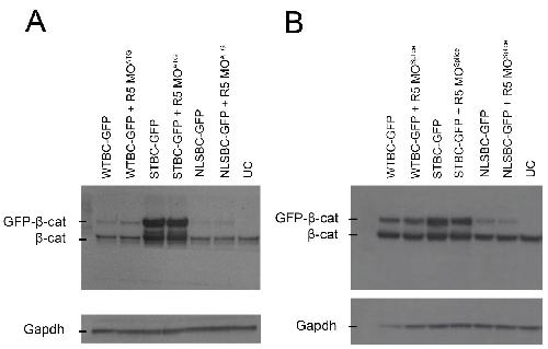 Figure S4. Related to Fig. 4 Translation of injected GFP tagged β-catenin mRNAs. Depletion of Rapgef5 by (A) ATG or (B) Splice MOs did not significantly affect translation of GFP tagged WT, ST, or NLS β-catenin mRNAs compared to controls. |