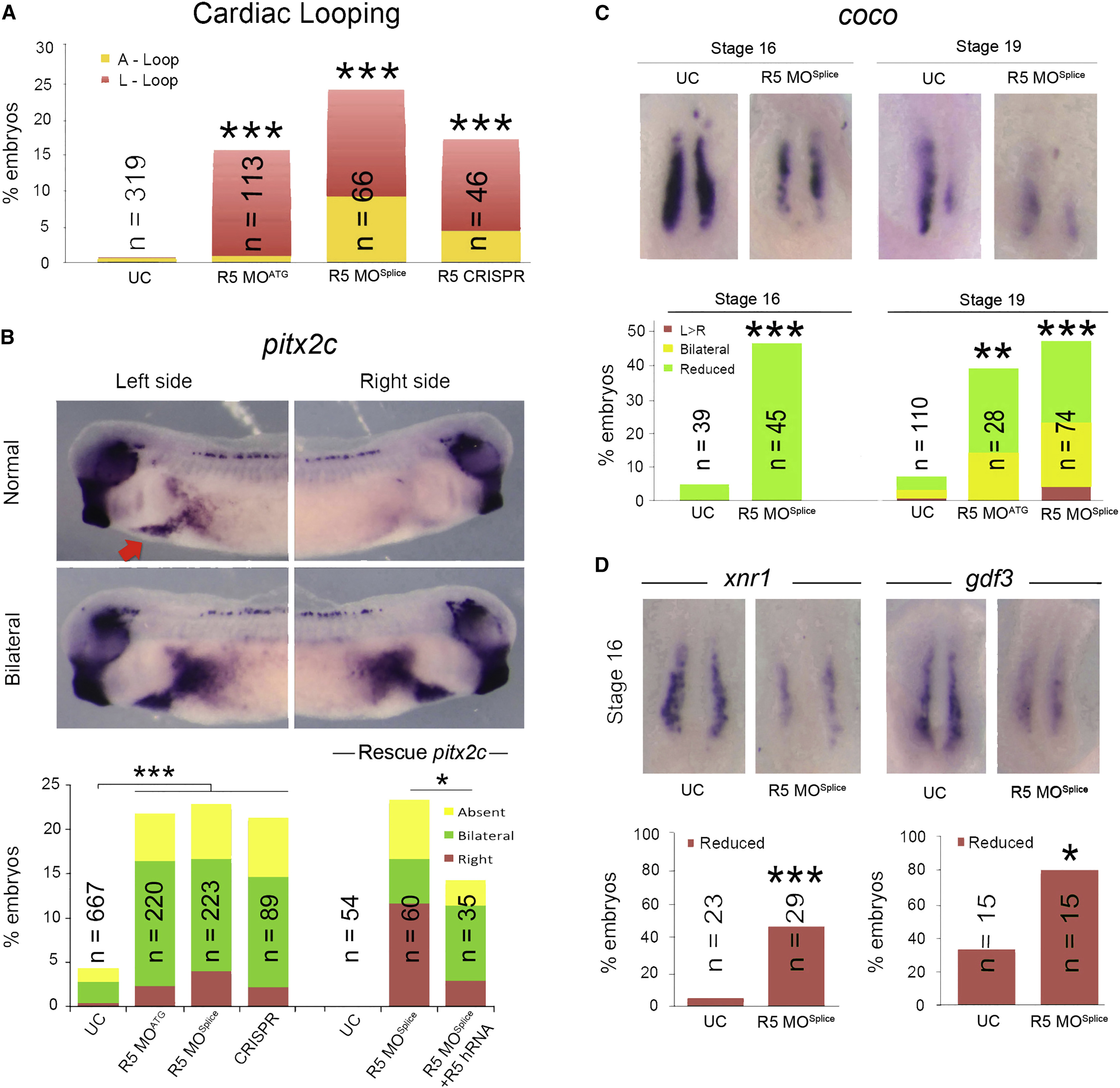 Figure S1. Related to Fig. 1; Depletion of Rapgef5. (A) Knockdown of Rapgef5 disrupts cardiac looping. Ventral views of Xenopus tadpoles with anterior to the top. Representative examples of a normal (D-loop outlined in blue lower panel), and abnormal (A-Loop outlined in green, L-Loop outlined in red) looped heart. Injection of a control MO or a control CRISPR (targeting tyrosinase) does not affect cardiac looping. (B) Injection of a control MO or control CRISPR (targeting tyrosinase) does not cause abnormalities in pitx2c expression. (C) The control (tyrosinase) CRISPR reduces pigment levels in stage 45 Xenopus embryos, demonstrating that the CRISPR/CAS9 system functions as expected. (D) Rationale of R5 MOSplice design. The splice MO targets the splice donor site at the start of intron 2. Failure to excise intron 2 results in a premature stop codon early in the Rapgef5 protein. RT-PCR confirms that R5 MOSplice causes retention of intron 2. In genomic DNA, intron 2 spanning primers amplify a band of 547bp. In WT cDNA, these primers amplify a band of 157bp. PCR primers amplifying cDNA from R5 MOSplice morphants generate a band at 547bp indicating retention of intron 2 in mRNA. A âno templateâ negative control is also included. A single asterisk indicates P<0.05 and a triple asterisk P<0.005. |
