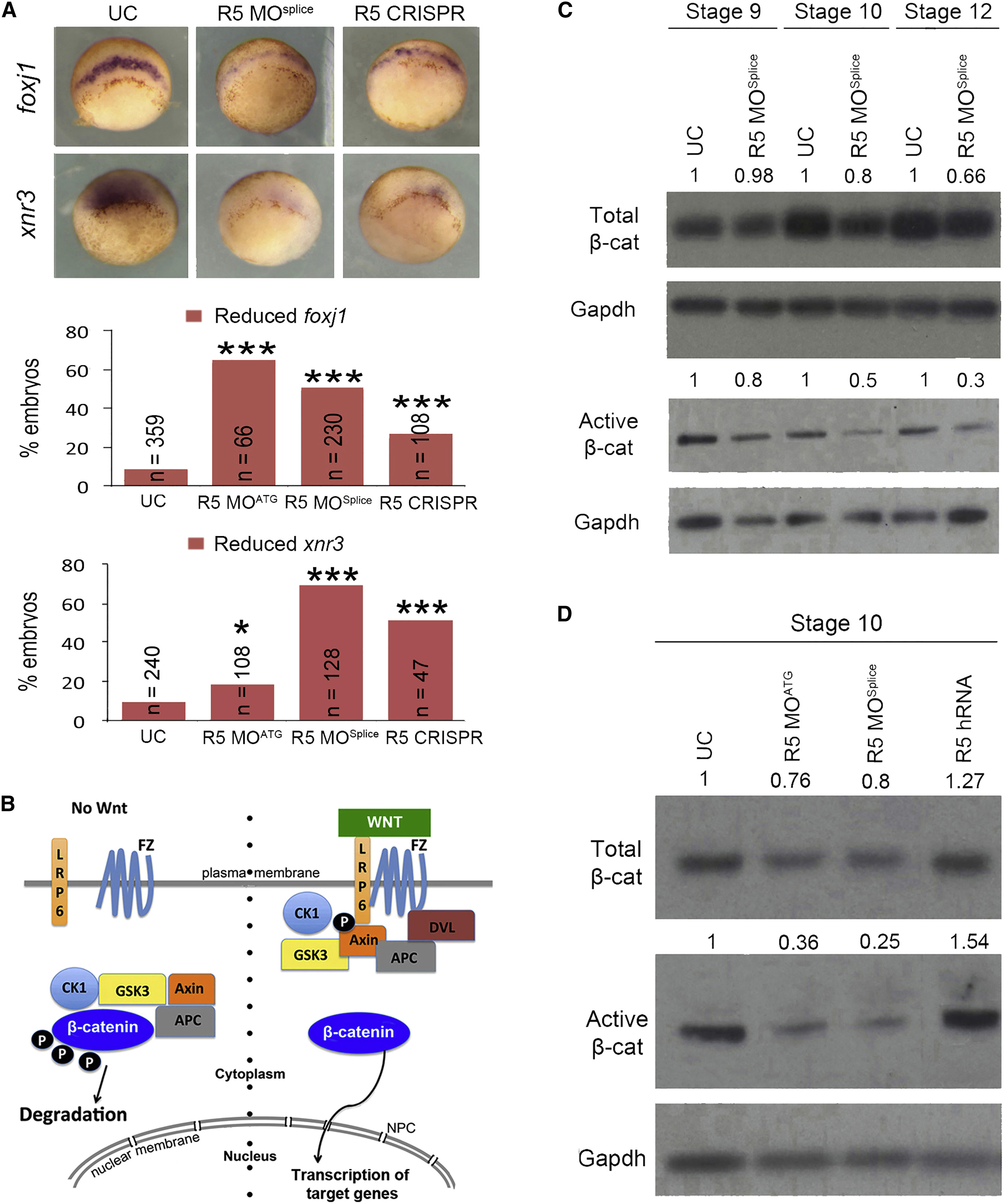 Figure 2. Depletion of Rapgef5 Impairs Canonical Wnt Signaling (A) Depletion of Rapgef5 using MOs or CRISPR impairs foxj1 and xnr3 expression in the dorsal blastopore lip of stage 10 embryos. (B) Simplified schematic of the canonical Wnt signaling pathway. Left side: in the absence of Wnt ligand, a destruction complex containing Axin and Gsk3 phosphorylates β-catenin, which marks it for cytoplasmic destruction. Right side: once the pathway is activated by Wnt ligand binding to Frizzled and Lrp receptors, phosphorylation of β-catenin by GSK3 is inhibited allowing β-catenin to accumulate in the cytoplasm and translocate into the nucleus to initiate transcription of Wnt target genes. (C and D) Levels of total and active β-catenin protein are essentially unchanged in Rapgef5-depleted embryos at stage 9 as assayed by western blot. However, both forms of β-catenin are reduced at stages 10 and 12. Note that levels of active β-catenin are much more severely affected. Conversely, overexpression of human RAPGEF5 mRNA results in a mild increase in total β-catenin levels and a more pronounced increase in active β-catenin levels. âp < 0.05, âââp < 0.005. See also Figure S3. |