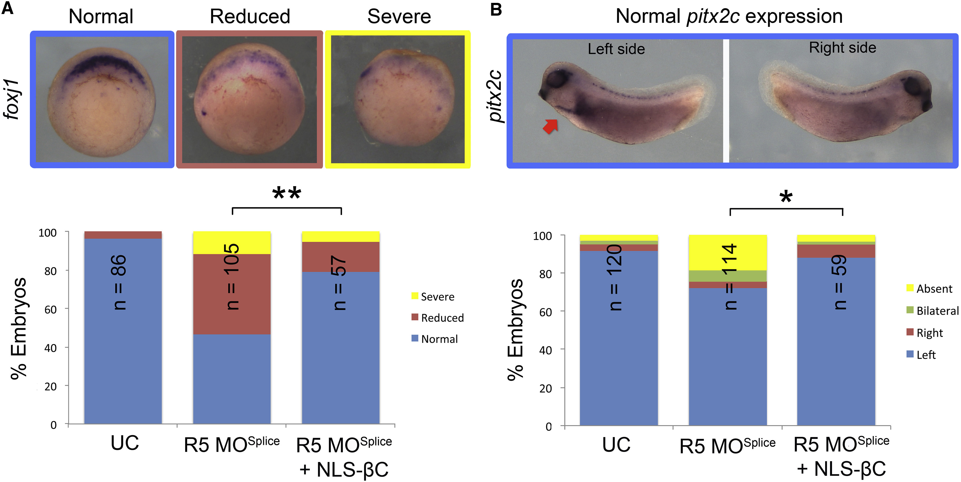 Figure 5. NLS β-Catenin Rescues foxj1 Transcription and LR Patterning Defects in Rapgef5 Morphants Depletion of Rapgef5 reduces the expression of the Wnt responsive gene foxj1 and alters LR patterning (pitx2c). Red arrow indicates an example of normal pitx2c expression on the left side of the embryo. Co-injection of 50 pg of NLS-β-catenin mRNA significantly rescues (A) expression of foxj1 at stage 10 and (B) pitx2c expression in Rapgef5 depleted embryos. âp < 0.05, ââp < 0.01. |