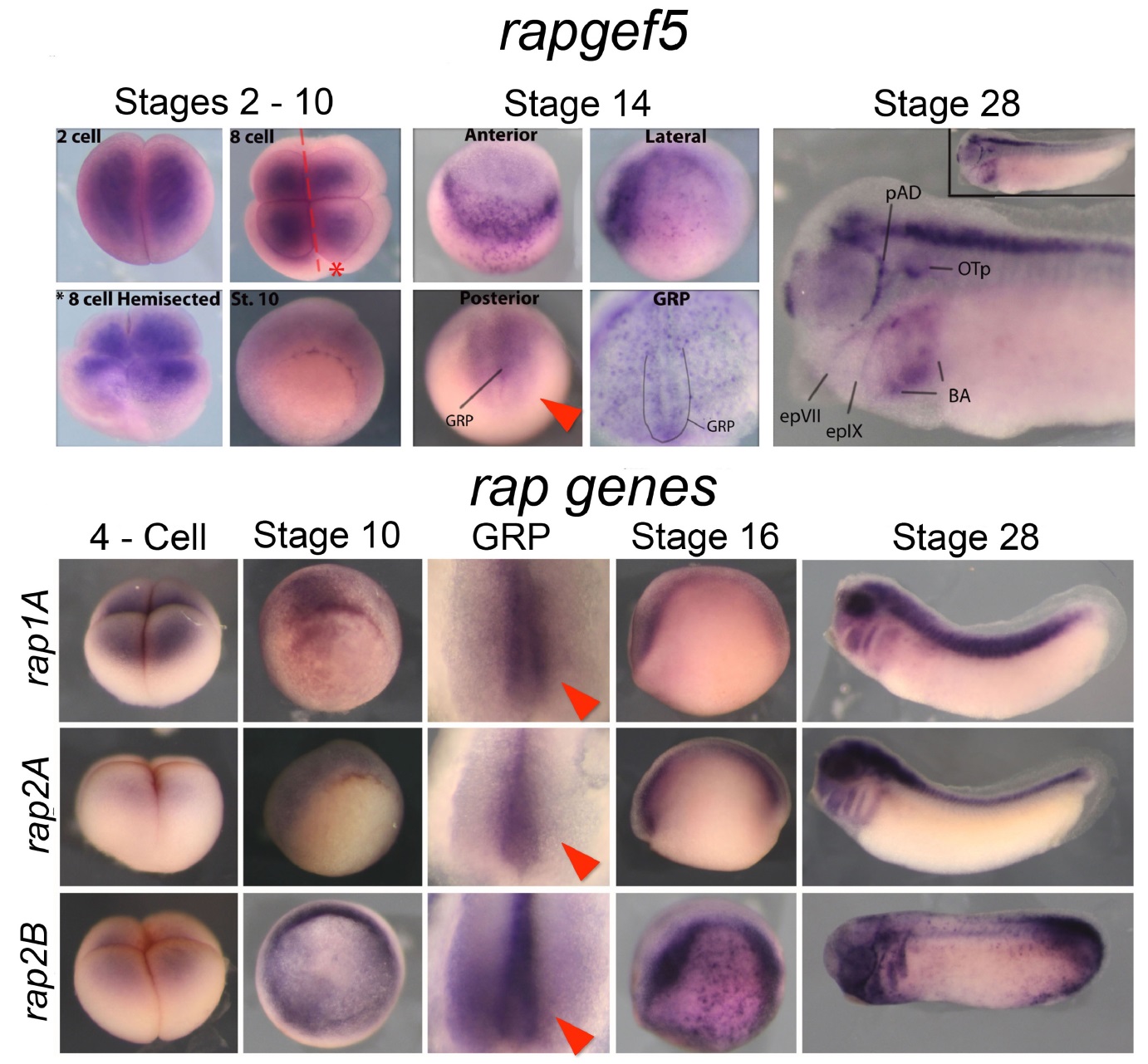 Figure S5. Related to Fig. 6; Developmental expression of Rapgef5 and Rap genes. In situ hybridization reveals rapgef5 mRNA is present from the earliest stages of development. It is detected in the animal pole at the 2 cell and 8 cell stages. In the stage 10 embryos expression appears diffuse around the blastopore. At stage 14 transcripts are detected in the anterior neural folds and forming GRP. rapgef5 expression is restricted to the anterior neural tube, brain, pharyngeal arches and cranial placodes at stage 28. rap1A, rap2A and rap2B are all expressed in the 4 cell embryo, in the gastrulating stage 10 embryo and in the GRP at stage 16. Expression of all three genes is also strong in the neural folds at stage 16, while rap2B also displays a speckled pattern on the lateral ectoderm. All three are expressed in the neural tube, brain, eye and pharyngeal arches at stage 28. |