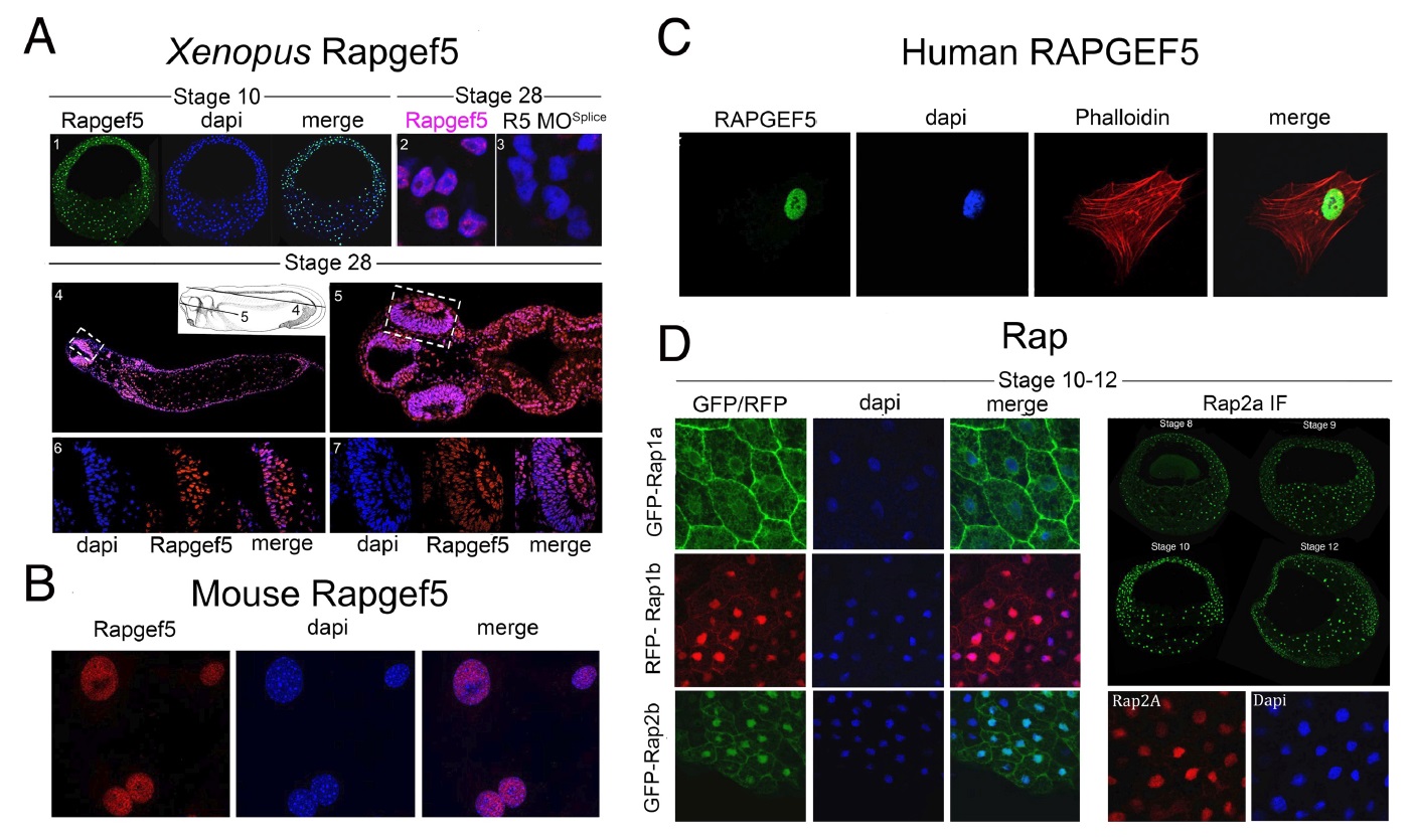 Figure S6. Related to Fig. 6; The subcellular localization of Rapgef5 and Rap proteins. (A1) Rapgef5 is localized to the nuclei in a section of a stage 10 Xenopus embryo. (A2 - 7) Rapgef5 is detected specifically in the nuclei of sectioned paraffin embedded stage 28 Xenopus embryos but is reduced in morphants (Compare A2 and A3, magenta Rapgef5, blue DAPI). The lines on the schematic in A4 represent the plane of section shown in A4 and A5. A6 and A7 are higher magnification of the white boxes in A4 and A5, respectively. (B, C) Rapgef5 localizes specifically to the nuclei of mouse MEFs and human RPE cells. (D) With the exception of Rap1A all rap proteins localize both to the plasma membrane and nucleus as assayed by injection of GFP/RFP tagged constructs or by immunofluorescence. |