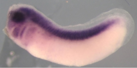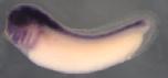 rapgef5 (Rap guanine nucleotide exchange factor 5) gene expression in Xenopus tropicalis embryo, assayed via in situ hybridization, NF stage 14, lateral view, anterior left, dorsal up. |