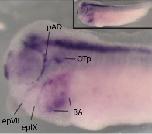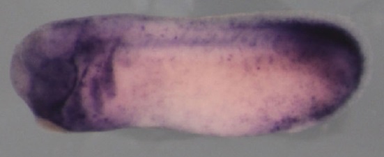 rapgef5 (Rap guanine nucleotide exchange factor 5) gene expression in Xenopus tropicalis embryo, assayed via in situ hybridization, NF stage 28, lateral view, anterior left, dorsal up. |