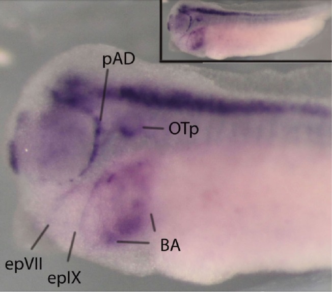 rap2a (RAP2A, member of RAS oncogene family) gene expression in Xenopus tropicalis embryo, assayed via in situ hybridization, NF stage 28, lateral view, anterior left, dorsal up. |