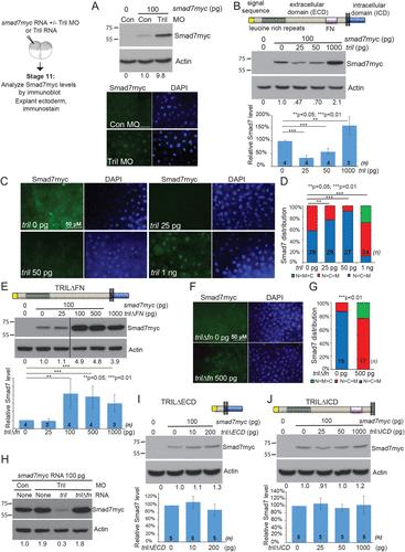 FIGURE 1:. Structureâfunction analysis of Tril. (A) Embryos were injected with RNA (100 pg) encoding Smad7myc together with control or Tril MOs (35 ng). Immunoblots of lysates from stage 11 embryos (10 per group) were probed with anti-Myc antibodies and then reprobed for β-actin. Relative level of Smad7myc, normalized to actin and reported relative to that in control embryos is indicated below each lane. Ectoderm was explanted from 5â10 embryos in each group at stage 11 and immunostained for Myc (all images taken under identical conditions). (B, E, I, J) RNA (100 pg) encoding Smad7Myc was injected into two-cell embryos alone or together with RNA encoding wild-type or deletion mutant forms of Tril. Immunoblots of lysates from stage 11 embryos (15 per group) were probed with anti-Myc antibodies and then reprobed for β-actin. Representative blots are shown. The relative level of Smad7myc, normalized to actin and reported relative to that in embryos injected with Smad7myc alone is indicated below each lane and quantitated and graphed below each blot (mean ± SD, n is the number of replicates as indicated on each column). In E, all lanes are from the same immunoblot, aligned following removal of an intervening lane (following the third lane, marked by a black bar). (C, D, F, G) smad7myc RNA was injected alone or together with increasing doses of tril (C, D) or 500 pg of trilâFN RNA (F, G) into one cell of two-cell embryos. Ectoderm was explanted from 7â15 embryos in each group at stage 11 and immunostained for Myc. Representative immunostaining is shown in C and F (all images taken under identical conditions), and results are quantified in D and G. Results are pooled from three independent experiments. The total number of explants analyzed is indicated on each column. (H) Embryos were injected with RNA (100 pg) encoding Smad7myc together with control or Tril MOs (35 ng) and tril or trilâfn RNA (100 pg) as indicated at the top of each lane. Immunoblots of lysates from stage 11 embryos (10 per group) were probed with anti-Myc antibodies and then reprobed for β-actin. Relative level of Smad7myc, normalized to actin and reported relative to that in control embryos is indicated below each lane. Results were replicated in three independent experiments.