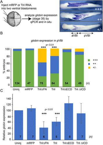 FIGURE 2:. Overexpression of Tril or TrilâFN inhibits blood formation. (A, B) RNA encoding mRFP or wild-type or deletion mutant forms of Tril was injected into both ventral cells of four-cell embryos, and expression of hba3.L was analyzed by WMISH at stage 34 in three experiments. hba3.L staining in the posteriorVBI (pVBI) was scored as absent or very weak (+/â), weak (++), or strong (+++), as illustrated. aVBI, anteriorVBI. n represents the number of embryos analyzed in each group, pooled from three independent biological replicates. (C) RNA encoding mRFP or wild-type or deletion mutant forms of Tril was injected into both ventral cells of four-cell embryos and expression of hba3.L was analyzed in 15 pooled embryos from each group by qPCR at stage 34. Mean ± SD are shown. n is the number of biological replicates, indicated on each column. ***p < 0.01 by two-tailed t test.