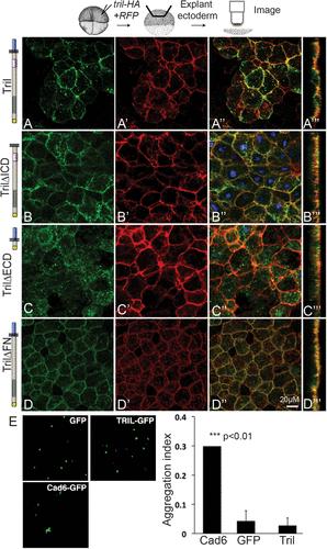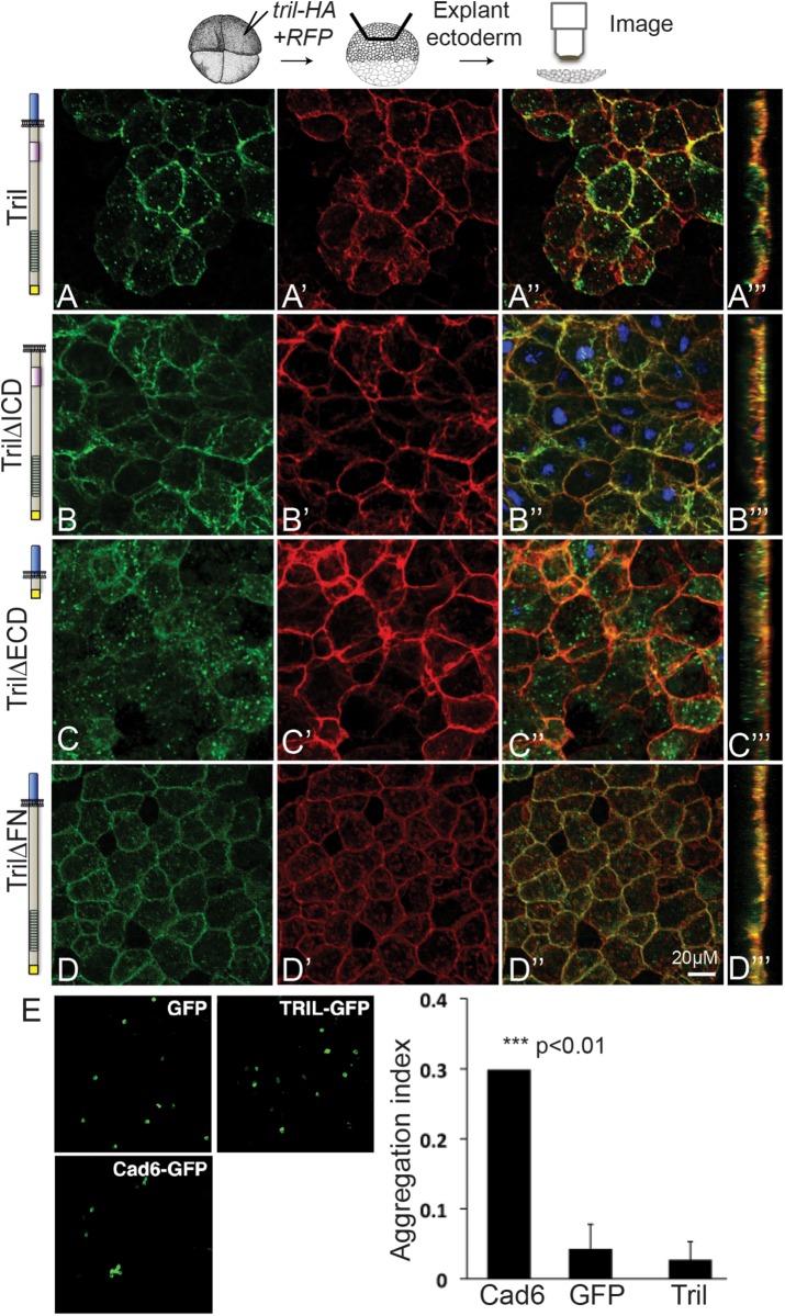 FIGURE 3:. The extracellular domain of Tril is required to retain it at the plasma membrane while the intracellular domain is required for internalization. (AâDâ´) RNAs encoding wild-type or deletion mutant forms of Tri-HA (illustrated to the left of each panel) and membrane-localized RFP (memRFP) were injected into a single animal pole blastomere of four-cell embryos. Ectoderm was explanted from 5â10 embryos in each group at stage 11 and immunostained for HA and RFP. (AâDâ³) Projections viewed from the xy-axis. (Aâ´âDâ´) Projections viewed from the z-axis. Results were replicated in three independent experiments. (E) CHO cells transfected with GFP (negative control), cadherin6-GFP (Cad6-GFP) (positive control), or Tril-GFP were tested for adhesion. Only cells expressing cadherin6 formed aggregates. The aggregation index was calculated by dividing the total GFP fluorescence in cell aggregates by the total GFP fluorescence in the well. Mean ± SD are shown, n = 3, ***p < 0.01 by two-tailed t test.