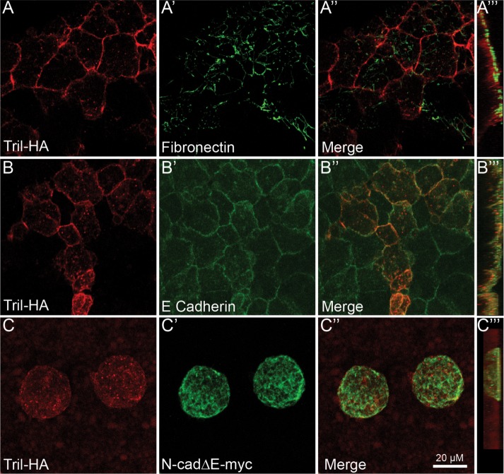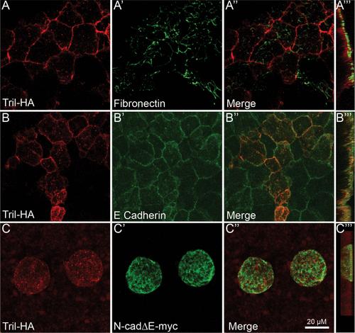 FIGURE 5:. Cadherin-mediated cellâcell adhesion is required for cell surface retention of Tril in Xenopus explants. (AâDâ´) RNA encoding Tril-HA (100 pg) was injected into a single animal pole blastomere of four-cell embryos. Ectoderm was explanted from 5â10 embryos in each group at stage 11 and immunostained for HA and Fibronectin (AâAâ´) or E-cadherin (BâBâ´). (CâCâ´) RNA encoding Tri-HA (100 pg) and N-cadâEmyc was coinjected into a single animal pole blastomere of four-cell embryos. Ectoderm was explanted from 5â10 embryos in each group at stage 11 and immunostained for HA and myc. Results were replicated in three independent experiments. AâCâ³â³ show projections viewed from the xy-axis and Aâ´âDâ´ viewed from the z-axis.