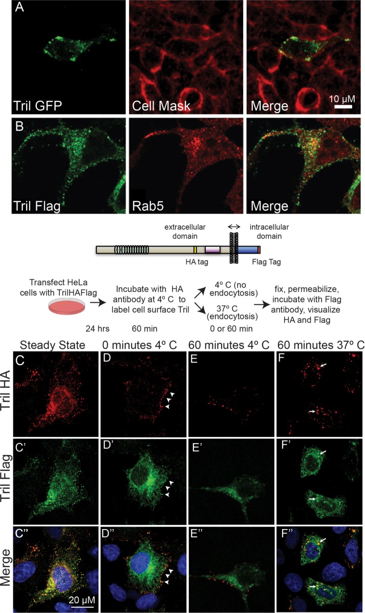 FIGURE 4:. Tril is retrieved from the cell surface into endosomes in HeLa cells. (A) HeLa cells were transiently transfected with DNA encoding human Tril-GFP. The plasma membrane was stained with CellMask 24 h later, and GFP was imaged in unfixed cells. (B) HeLa cells were transfected with DNA encoding human Tril-Flag. Cells were fixed 24 h later and double-label immunostained with antibodies specific for Flag and Rab. All results were replicated in three experiments. (CâF) Hela cells were transiently transfected with DNA encoding HA- and Flag-epitope tagged Xenopus Tril (illustrated above panels). Cells were either permeabilized and double-label immunostained with antibodies specific for both epitopes (CâCâ³) or were incubated at 4°C with anti-HA antibodies for 1 h and then either permeabilized immediately (DâDâ³) or incubated at 4°C (EâEâ³) or at 37°C (FâFâ³) for 1 h before permeabilization and addition of antibodies specific for the Flag tag. HA and Flag epitopes were visualized with species specific fluorescent secondary antibodies. The white arrowheads in DâDâ³ denote Tril present at the cell surface while the white arrows in FâFâ³ indicate Tril present in intracellular compartments. Results were replicated in three independent experiments.
