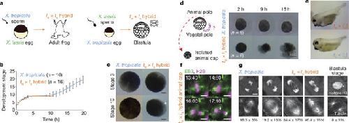 Figure 1. a, Schematic of X. laevis and X. tropicalis cross-fertilization outcomes. b, Developmental timing in X. tropicalis and te × ls hybrid embryos. Average is plotted for each time point. Error bars, s.d. c, Representative images of X. tropicalis and te × ls hybrid embryos at stages 3 and 10 from experiments in b (n = 16 X. tropicalis and n = 16 te × ls hybrid embryos from four independent experiments). Arrow indicates vegetal cells where death initiates. d, Schematic of animal cap assay and images of at 2, 9, and 16 h after isolation. Six animal caps were imaged and identical results were obtained in three different experiments. Scale bars in c and d, 200 μm. e, Images showing haploid phenotype following fertilization of X. tropicalis eggs with ultraviolet-irradiated sperm. Identical results were observed in n = 3 experiments. f, Time-lapse images of dividing cell in a te × ls hybrid animal cap (Supplementary Video 5). Arrow indicates a mis-segregated chromosome. Mis-segregated chromosomes were observed in n = 3 live te × ls hybrid animal caps in three experiments. Time is in minutes:seconds. g, Immunofluorescence images showing chromosome bridges, mis-segregated chromosomes, and micronuclei throughout te × ls hybrid embryos. Scale bars in f and g, 10 μm. Quantification of n = 81 X. tropicalis and n = 78 te × ls hybrid anaphases in n = 17 and 16 embryos, respectively, from four datasets obtained from three experiments presented as averages ± 1 s.d., show a significant difference by Fisher’s 2 × 3 contingency test (P = 0). Quantification of micronuclei in te × ls hybrid embryos is detailed in Extended Data Fig. 1b. |