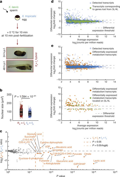 Figure 3. a, Schematic of polar body suppression experiment and images of tte × ls rescued embryos 24 and 48 h.p.f. A total of nine tte × ls embryos were obtained in four different experiments. b, Box plot of nuclear sizes (n = 988 nuclei from three tte × ls embryos and n = 777 from three X. tropicalis embryos at stage 21) showing the average area as thick lines and 1 s.d. as grey boxes. Ninety-five per cent confidence intervals are 98.1 ± 2.2 μm2 for tte × ls and 78.0 ± 1.7 μm2 for X. tropicalis embryos. P values were determined by two-tailed heteroscedastic t-test. c, Levels of 179 metabolites in X. tropicalis and te × ls hybrid embryos 7 h.p.f. Levels were obtained from five samples from three independent fertilizations, each averaged and plotted as log2 of the ratio with the control (see Methods). P values were calculated using a two-tailed homoscedastic t-test. The average and 1 s.d. for the differentially represented metabolites are shown, and 95% confidence intervals given in Extended Data Fig. 3b. d, Differential gene expression between te × ls and te × ts (see Methods). All detected transcripts (n = 8,379) are plotted in blue. Transcripts corresponding to genes lost from chromosomes 3L and 4L (n = 270) are plotted in green. e, Differential expression of metabolism genes between te × ls and te × ts (see Methods). Differentially expressed metabolism transcripts (n = 165) are plotted in orange, all detected transcripts (n = 8,379) in blue (top), and differentially expressed metabolism transcripts located on chromosomes 3L and 4L (n = 35) in green (bottom). |