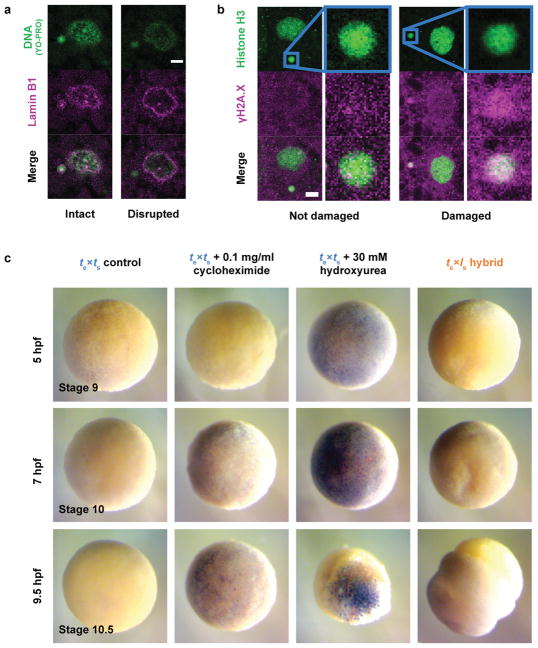 Extended Data Figure 2. Characterization of micronuclei in te×ls hybrid embryos and link to embryo deatha, Disrupted micronuclei envelopes in te×ls hybrid embryos. Whole mount embryo immunofluorescence was performed in te×ls hybrid embryos using the YO-PRO DNA dye (top) and anti-Lamin B1 antibody (middle), corresponding channels are shown in green and magenta, respectively. The merged images are shown below. 25 micronuclei within 5 different embryos were analyzed. Intact (left) and disrupted (right) envelopes were observed in all analyzed embryos. Scale bar is 10 μm. b, DNA damage in te×ls hybrid embryo micronuclei. Whole mount embryo immunofluorescence was performed in te×ls hybrid embryos using anti-histone H3 (top) and anti-γH2A.X (middle) antibodies, corresponding channels are shown in green and magenta, respectively. The merge images are shown below. 21 micronuclei within different 6 embryos were analyzed. Micronuclei with undamaged (left; negative γH2A.X signal) and damaged (right; positive γH2A.X signal) DNA were observed in all analyzed embryos. Zoomed images of micronuclei are shown on the right of each image. Scale bar is 10 μm. c, TUNEL assay in apoptotic X. tropicalis and te×ls hybrid embryos. X. tropicalis (left), X. tropicalis treated with cycloheximide (middle left) or hydroxyurea (middle right) as indicated, and te×ls hybrid (right) embryos were prepared for TUNEL assay 5 hpf (equivalent stage 9; top), 7 hpf (equivalent stage 10; middle) and 9.5 hpf (equivalent stage 10.5; bottom). Identical results were obtained over 3 different experiments. Representative images are shown and were taken under identical conditions. |