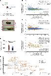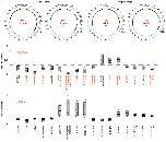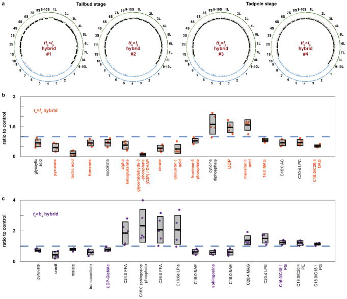 Extended Data Figure 3. Whole genome sequencing of tte×ls rescued embryos and metabolomic profiling of te×ls and te×bs hybrid embryosa, The genomes of 4 tte×ls rescued embryos were sequenced, aligned, and normalized to the genomes of X. tropicalis (blue) and X. laevis (green) for which sub-genomes S and L were distinguished (S in light green and L in dark green). Underrepresented regions of the genomes are color-coded in black. The tte×ls embryo genomes 1–2 were prepared from tailbuds, and 3–4 from tadpoles. b, Metabolites differentially represented between te×ls hybrid and X. tropicalis embryos 7 h post fertilization. Among the 179 metabolites detected, 17 were significantly altered in te×ls hybrid embryos (p < 0.05; two-tailed homoscedastic t-test; individual p-values are provided in Figure 3c source data) and are shown as a ratio to the X. tropicalis control (blue dashed line). Levels were obtained from 5 samples from 3 independent fertilizations each. Values for the te×ls hybrid are plotted in orange. The averages are shown as thick lines and the gray boxes correspond to 1 standard deviation. 95% confidence intervals are, from left to right, 0.69±0.24, 0.46±0.26, 0.16±0.16, 0.68±0.18, 0.70±0.21, 0.58±0.25, 0.10±0.09, 0.42±0.19, 0.38±0.27, 0.79±0.15, 1.61±0.61, 1.47±0.33, 1.58±0.33, 0.83±0.11, 0.71±0.18, 0.70±0.19, and 0.53±0.08. Metabolites with p values below the penalized Bonferroni corrected threshold (n = 12) are labeled in orange. c, Metabolites differentially represented between te×bs hybrid and X. tropicalis embryos 7 h post fertilization. Among the 241 metabolites detected, 17 were significantly altered in te×bs hybrid embryos (p < 0.05; two-tailed homoscedastic t-test; individual p-values are provided in Figure 4g source data) and are shown as a ratio to the X. tropicalis control (blue dashed line). Levels were obtained from 5 samples from 3 independent fertilizations, each. Values for the te×bs hybrid are plotted in purple. The averages are shown as thick lines and the gray boxes correspond to 1 standard deviation. 95% confidence intervals are, from left to right, 0.73±0.12, 0.44±0.26, 0.80±0.10, 0.61±0.21, 0.78±0.14, 1.86±0.9, 2.33±1.33, 2.07±1.07, 2.07±1.17, 0.63±0.19, 0.59±0.16 0.61±0.22, 1.39±0.37, 1.51±0.38, 1.24±0.14, 1.21±0.18, and 1.14±0.10. Metabolites with p values below the penalized Bonferroni corrected threshold (n = 3) are labeled in purple. |
