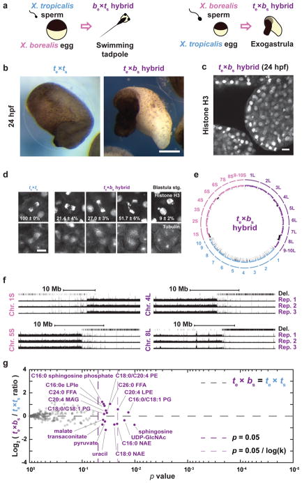 Figure 4. Chromosomal loss in exogastrulating te×bs hybrid embryosa, Schematic of X. borealis and X. tropicalis cross-fertilization outcomes. b, Representative images of te×ts vs. te×bs embryos at 24 hpf. This result was reproduced in 4 separate experiments. Scale bar, 200 μm. c, Immunofluorescence image of te×bs hybrid embryo at 24 hpf showing nuclei and micronuclei. Similar defects at this stage were observed in 6 different embryos. d, Immunofluorescence images showing chromosome bridges, mis-segregating chromosomes, and micronuclei throughout te×ls hybrid embryos. Scale bars, 20 μm. Quantification of n = 33 X. tropicalis and 63 te×bs hybrid anaphases in n = 6 and 12 embryos, respectively, show a significant difference by Fisher 2 by 3 contingency test (p = 0). Quantification of micronuclei in te×bs hybrid embryos is detailed in Extended Data Figure 4b. e, Circle plot of whole genome sequencing data for te×bs hybrid embryos aligned and normalized to the genomes of X. tropicalis (blue) and X. borealis (purple). Underrepresented genome regions (black) represent 9.674% of chromosome 4L, 74.66% of 8L, 4.71% of 1S, and 14.4% of 5S. f, Expanded view of chromosome 1S, 5L, 4L and 8L breakpoints with deleted regions indicated in three biological replicates. g, Levels of 241 metabolites in X. tropicalis and te×bs hybrid embryos 7 hpf (see Methods). Levels were obtained from 5 samples from 3 independent fertilizations, each, averaged and plotted as Log2 of the ratio with the control (see Methods). P-values were calculated using a two-tailed homoscedastic t-test. The average and 1 standard deviation for the differentially represented metabolites are shown, and 95% confidence intervals given in Extended Data Figure 3c. Note that few metabolites are altered significantly and are distinct from those altered in te×ls hybrids (see Extended Data Figure 3b–c). |