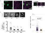 Extended Data Figure 4. Characterization of micronuclei in te×bs hybrid embryosa, DNA damage in te×bs hybrid embryo micronuclei. Whole mount embryo immunofluorescence was performed in te×bs hybrid embryos using anti-histone H3 (left) and anti-γH2A.X (middle) antibodies, corresponding channels are shown in green and magenta, respectively. The merged image is shown on the right. 34 micronuclei within 8 different embryos were analyzed. Micronuclei with damaged DNA were observed in all analyzed embryos. Zoomed images of micronuclei are shown on the right in the same left-to-right order. Scale bar is 20 μm. b, Micronuclei in te×bs hybrid embryos at various developmental stages (top). Whole mount embryo immunofluorescence was performed in te×bs hybrid embryos using anti-histone H3 antibody at stages 6, 7, 8 and 9. Scale bar is 20 μm. Quantification of micronuclei in te×bs hybrid embryos (bottom). The percentage of micronuclei was calculated as the number of micronuclei in the imaged portion of the embryo divided by the total number of nuclei in the same imaged portion. The average percentage for multiple embryos at stage 6 (n = 5 te×bs hybrid embryos (individual dots) with a total of 125 nuclei), stage 7 (n = 7/153), stage 8 (n = 9/731) and stage 9 (n = 10/2691) is shown as a thick line. Gray boxes correspond to 1 standard error of the mean. Control X. tropicalis embryos from the same mothers were analyzed but no micronuclei were observed at any stages. c, Micronuclei size in te×bs and te×ls hybrids. Size is plotted as the ratio between the volumes of the micronucleus and its corresponding nucleus. Each dot represents an individual data point (n = 329 micronuclei from 36 te×bs embryos shown in purple and n = 100 from 17 te×ls embryos shown in orange, from 4 independent experiments). The thick black line indicates the average and the grey box corresponds to 1 standard deviation. 95% confidence intervals are 2.9±0.36% for te×bs and 1.6±0.28% for te×ls embryos. Statistical significance was shown using a two-tailed heteroscedastic t-test. |