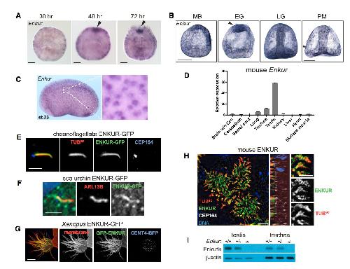 Figure 5. ENKUR Is a Conserved Ciliary Protein Expressed by Cells with Motile Cilia (A) Whole-mount in situ hybridization for Enkur in N. vectensis embryos at various developmental stages. Enkur is expressed throughout the embryo and is enriched at the aboral pole (arrowhead) in 48- and 74-hr embryos. Scale bar, 50 mm. (B) In situ hybridization for Enkur in S. purpuratus embryos at mesenchyme blastula (MB), early gastrula (EG), late gastrula (LG), and prism (PM) stages. Scale bar, 50 mm. Enkur is expressed in all cells and enriched at the apical pole (arrowhead) in EG embryos. (C) In situ hybridization of stage-23 Xenopus laevis embryo shows expression of Enkur in epidermal cells. (D) qRT-PCR measurement of Enkur detected expression in isolated adult mouse lungs, trachea, and testis. Error bars represent SDs from 6 technical replicates. Expression was validated using 2 distinct primer pairs. (E) Immunofluorescent staining of S. rosetta ENKUR fused to GFP (green), cilia (TUBac, red), and the basal body (CEP164, blue) expressed in IMCD3 cells. Scale bar, 2.5 mm. (F) Immunofluorescent staining of cilia (ARL13B, red) and a fusion of S. purpuratus ENKUR with GFP (green) expressed in RPE-1 cells. ENKUR-GFP localizes to cilia. Nuclei are stained with Hoechst (blue). Scale bar, 2.5 mm. (G) A multiciliated epidermal cell of a stage-23 X. laevis embryo expressing X. laevis ENKUR fused to GFP (green), membrane-red fluorescent protein (red), marking the plasma and ciliary membranes, and Centrin 4 (CENT4)-blue fluorescent protein (BFP, blue) to mark the basal bodies. ENKUR localizes along the length of cilia. Scale bar, 10 mm. (H) Immunofluorescent staining of primary cultured mouse tracheal epithelial cells for ENKUR (green), cilia (TUBac, red), and basal bodies (CEP164, white), and imaged using structured illumination microscopy. ENKUR localizes to mouse tracheal epithelial cilia. Scale bar for whole cells (top and center panels), 5 mm. Scale bar for cilia (right panel), 2.5 mm. (I) Immunoblotting for ENKUR protein in testis and trachea lysates from littermate control and Enkur -/- mice. ENKUR is expressed in testis and trachea, whereas Enkur -/- mice do not produce detectable ENKUR. See also Figures S4 and S5. |