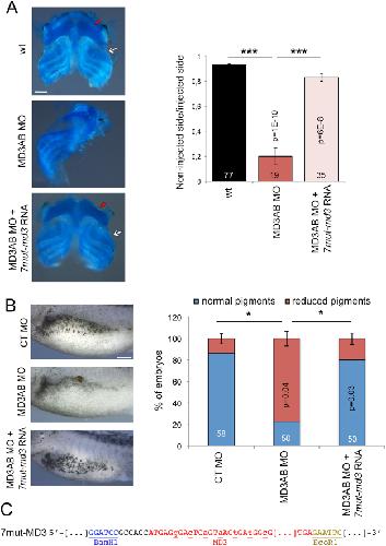 Figure 2. MarvelD3 depletion disrupts neural crest derivatives development. (A) Craniofacial cartilage morphology was analysed and its size measured in control, MD3AB morpholino-injected embryos and embryos co-injected with 7mut-marveld3 mRNA. Note, ceratohyal (red arrowhead) and ceratobranchial (white arrow) cartilage was reduced in MarvelD3 morphants. (B) The lateral line pigmentation (stage 42) pattern was analysed and quantified in control morpholino, MD3AB morpholino-injected embryos and embryos co-injected with 7mut-marveld3 mRNA. Scale bars, 500 μm; Student t-test p values and the number of embryos analysed are indicated on the graph; blue bar, normal pigments; red bar, reduced pigments; the number craniofacial cartilage samples analysed is indicated on the graph; black bar, wt; red bar, MD3AB morpholinos; light red bar, MD3AB morpholinosâ+â7mut-marveld3 RNA. (C) 7mut-marveld3 was subcloned in pCS2+âvector (BamH1/ EcoR1). Restriction sites: underlined; mutated bases of marveld3: underlined lower cases. |