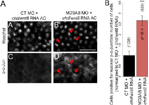 Figure 8. MarvelD3 depletion activates JNK signalling. Analysis of JNK signalling by immunofluorescence using an antibody against phosphorylated form of c-Jun (p-c-Jun) in animal caps injected with chd mRNAâ+âwnt8 mRNAâ+âcontrol morpholino (A,C) or chd mRNAâ+âwnt8 mRNAâ+âMD3AB morpholinos (B,D). Nuclei were stained with Hoechst; red arrowheads: examples of nuclear co-localization between Hoechst and p-c-Jun staining; scale bar, 50 μm. (E) Quantification of the number of cells with a positive nuclear p-c-Jun staining / total number of cells. Mann-Whitney test p values and the total of cells counted (number in brackets) are indicated on the graph; the values are normalized to control morpholinoâ+âchd mRNAâ+âwnt8 mRNA; black bar, chd mRNAâ+âwnt8 mRNAâ+âcontrol morpholino; red bar, chd mRNAâ+âwnt8 mRNAâ+âMD3AB morpholinos. |