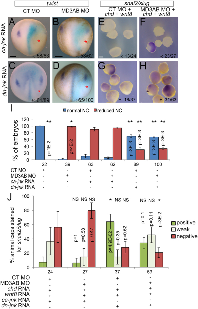 Figure 10. JNK pathway inhibition is required for neural crest formation in MarvelD3 knockdown embryos. Neural crest induction (stage 15) was analysed and quantified by WISH against twist in control and MD3AB morpholino embryos co-injected with constitutively active-jnk (ca-jnk) or dominant negative-jnk mRNA (dn-jnk) (AâD and I) and against snai2/slug in animal caps co-injected with chd mRNAâ+âwnt8 mRNAâ+âcontrol morpholino or chd mRNAâ+âwnt8 mRNAâ+âMD3AB morpholinos and with constitutively active-jnk or dominant negative-jnk mRNA (EâH and J). Mann-Whitney test p values and the number of embryos or animal caps analysed are indicated; red asterisk, injected side of the embryo with light blue β-galactosidase staining. (I) blue bar, normal neural crest; red bar, reduced neural crest; (J) dark green bar, positive; light green bar, weak; red bar, negative snai2/slug staining.â+â, embryos or animal caps positive or weak for twist or snai2/slug expression; -, embryos or animal caps negative for twist or snai2/slug expression. Scale bars, 500âμm. |