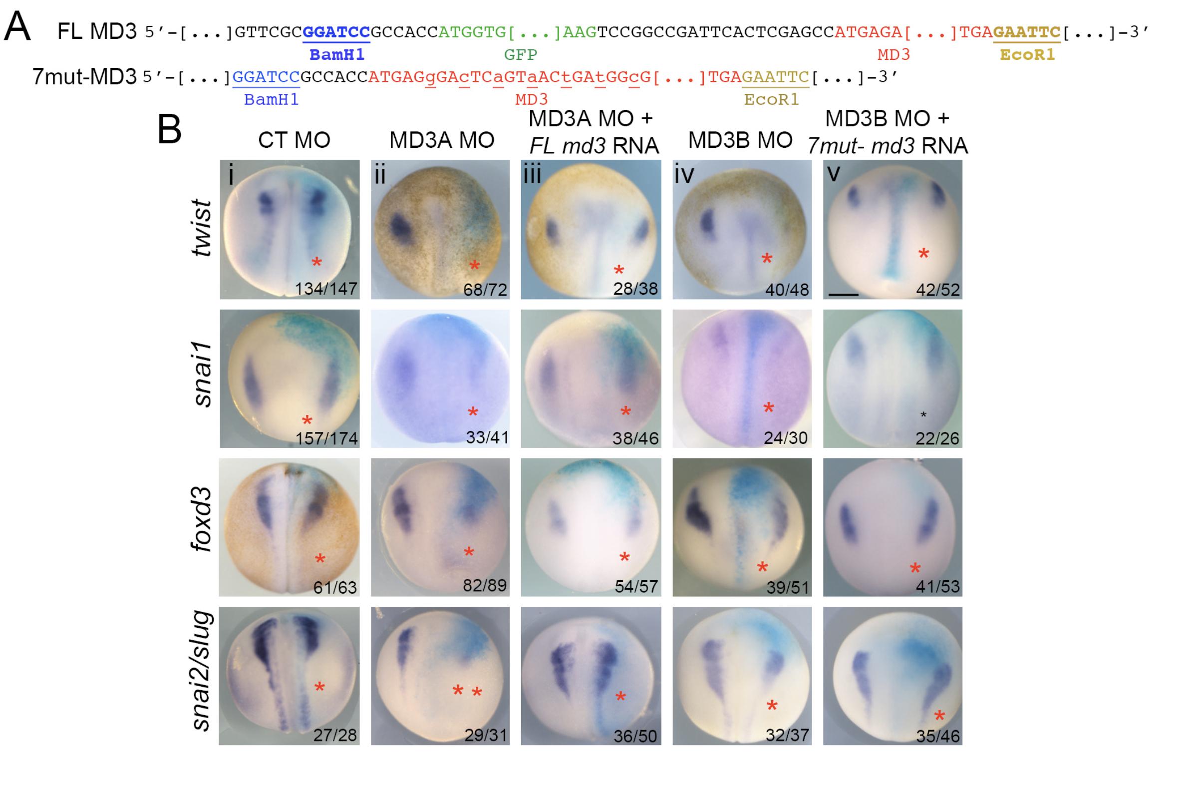 Supplemental Figure S1. Depletion of MarvelD3 and neural crest development. (A) gfp-fl marveld3 was inserted in pCS2+ vector (BamH1/EcoR1). 7mut-marveld3 was subcloned in pCS2+ vector (BamH1/ EcoR1). Restriction sites: underlined; mutated bases of marveld3: underlined lower cases. (B) neural crest induction (stage 15) was determined by WISH for twist, snai1, foxd3 and snai2/slug in control morpholino- (i), MD3A morpholino- (ii), MD3B morpholino-injected embryos (iv) and embryos co-injected with FL marveld3 (iii) or 7mut-marveld3 mRNA (v), respectively; the number of embryos analysed is indicated at the bottom right of each panel; red asterisk, injected side of the embryo with light blue β- galactosidase staining; purple corresponds to the WISH staining; scale bar, 500 μm. |