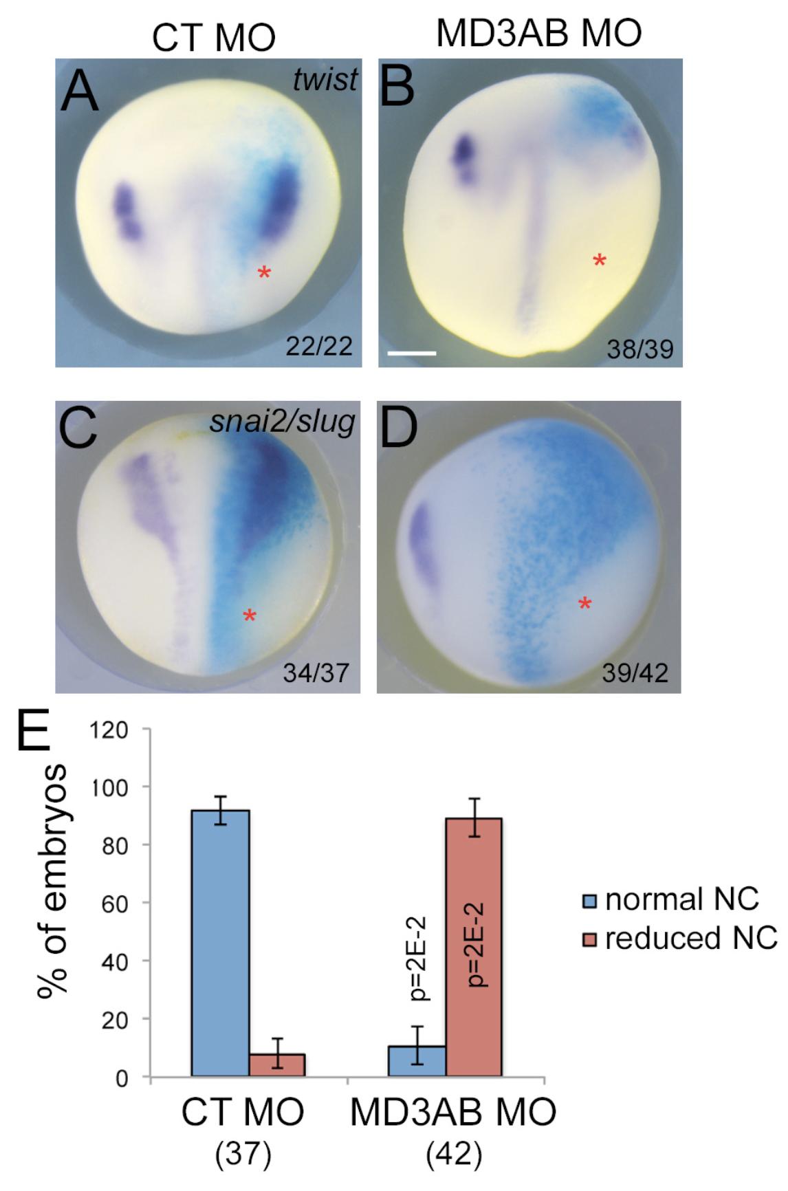 Supplemental Figure S5. Morpholino control experiments for JNK pathway experiments in figure 10. WISH against twist (A, B) and snai2/slug (C, D) in control or MD3AB morpholino-injected embryos, corresponding controls for Fig. 10A-D and Fig. 10E-H, respectively. Scale bar, 500 μm. (E) Quantification of the neural crest phenotype through snai2/slug expression for (C, D). The number of embryos analysed is indicated at the bottom right of each panel or under the graph; red asterisk, injected side of the embryo with light blue β-galactosidase staining. Mann-Whitney test p values are indicated; blue bar, normal neural crest; red bar, reduced neural crest. |