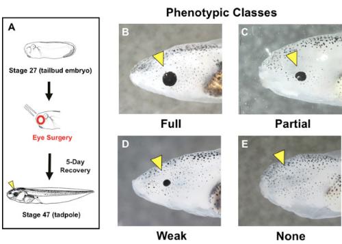To compare the quantity and quality of regrowth in operated eyes versus control eyes, we developed a Regrowth Index (RI) similar to one previously described for tail regeneration. Based on the calculation of the percentage of the number of individuals grouped to each category, each category is then multiplied by 3 (full), 2 (partial), 1 (weak), or 0 (none). The resulting number is a value ranging from 0 to 300, constituting the RI. A value of 0 denotes no regeneration in any of the individuals in the group, while a value of 300 denotes full regeneration in 100% of individuals within the tested group.