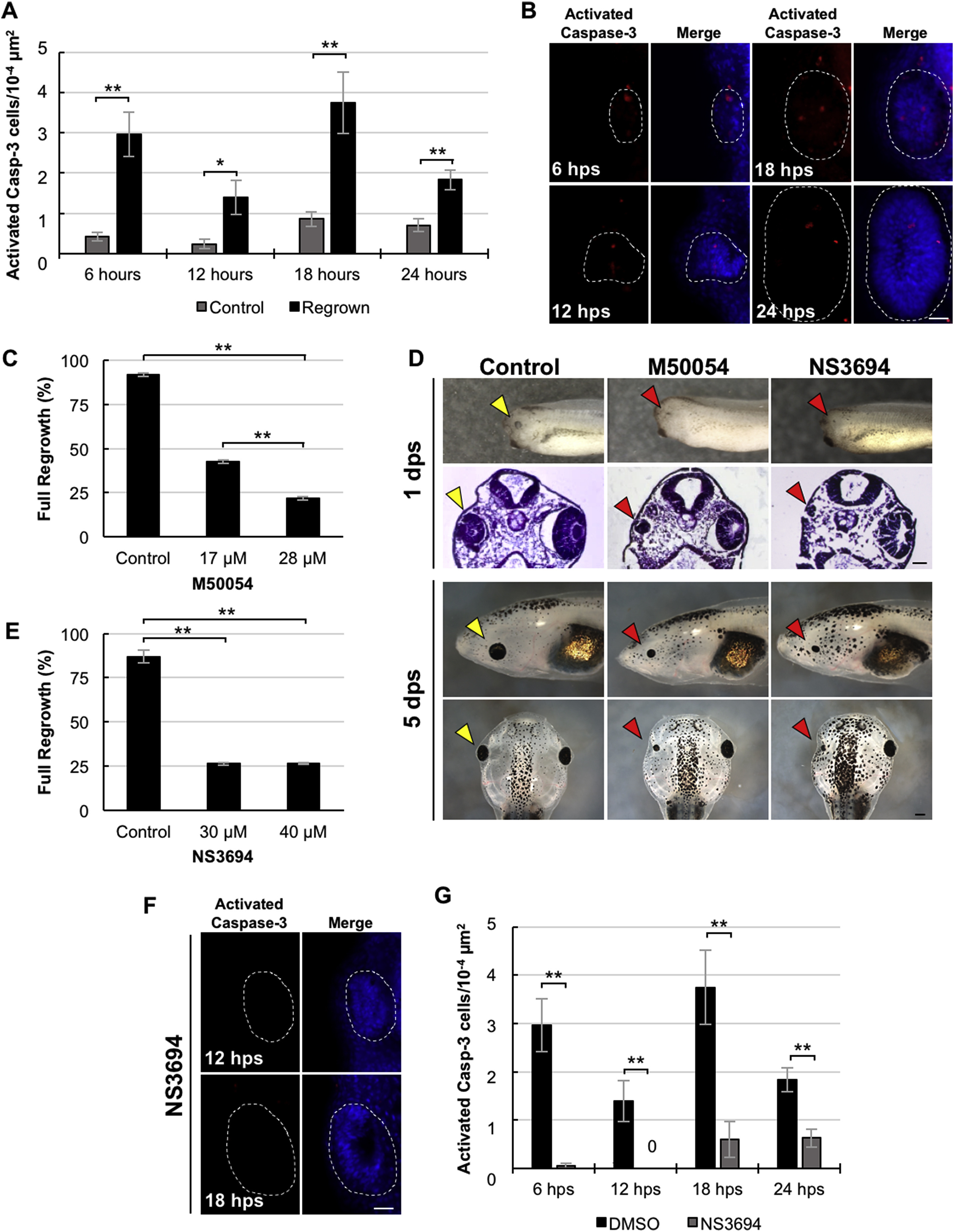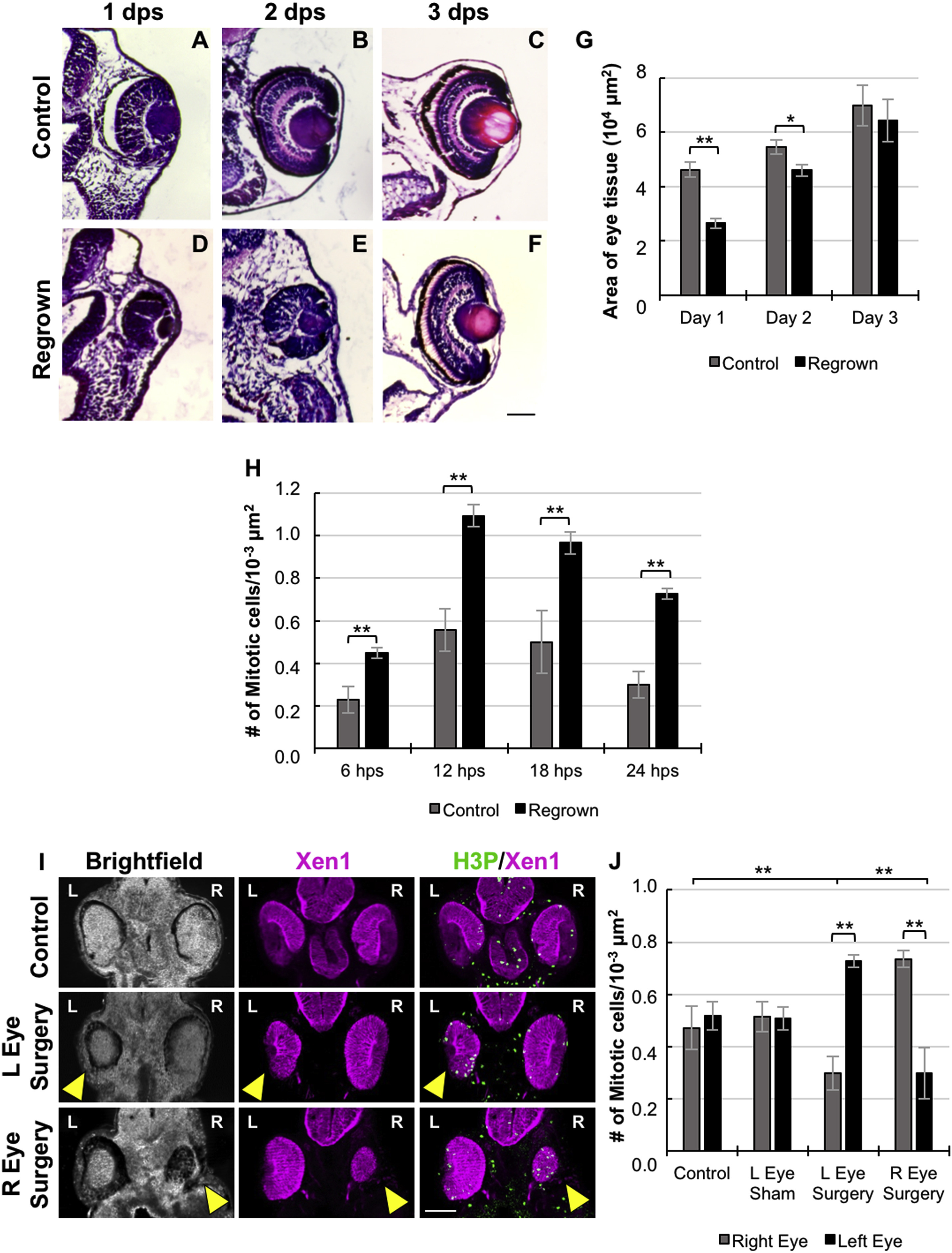 Proliferation accompanies Xenopus eye regrowth. Hematoxylin and eosin stained sections of unoperated eyes (top panels, A-C) compared to age-matched regrowing eyes (bottom panels, D-F). (D) At 1 dps, a small regrowing eye is seen at surgery site. (E) At 2 dps, retinal layer formation is delayed as compared to control (B). (F) By 3 dps, an eye comparable to control is apparent with similar eye organization and size. Representative images are shown. (G) Timecourse of growth rate after surgery as compared to contralateral unoperated eye at day 1 (57.2%, n = 7), day 2 (84.4%, n = 5), day 3 (92.1%, n = 6). * denotes p < 0.05, ** denotes p < 0.01. Data are means ± SEM. (H) Quantification of mitoses in the regrowing eye structure at the following timepoints: 6, 12, 18, and 24 hps (hps = hours post surgery). There is an increase in the number of mitotic cells in regions where tissue removal surgery was performed compared to the contralateral control side. ** denotes p < 0.01 (n>5 per timepoint). Data are means ± SEM. (I and J) Assessment of mitoses in the regrowing eye at 24 hps. (I) Mitotic cells are indicated in green by anti-phospho Histone H3 signal. Xen1 indicated neural tissues. Closed arrowheads in the brightfield panels indicated regrowing eyes. (J) Quantification of mitoses in embryos under different conditions as shown. Mitoses are increased in regions where tissue removal surgery was performed, but not in the control or sham-operated eye. L indicates left side. R indicates right side. (A-F, I) Up = dorsal, down = ventral. Scale bars: A-F, I = 50 μm.