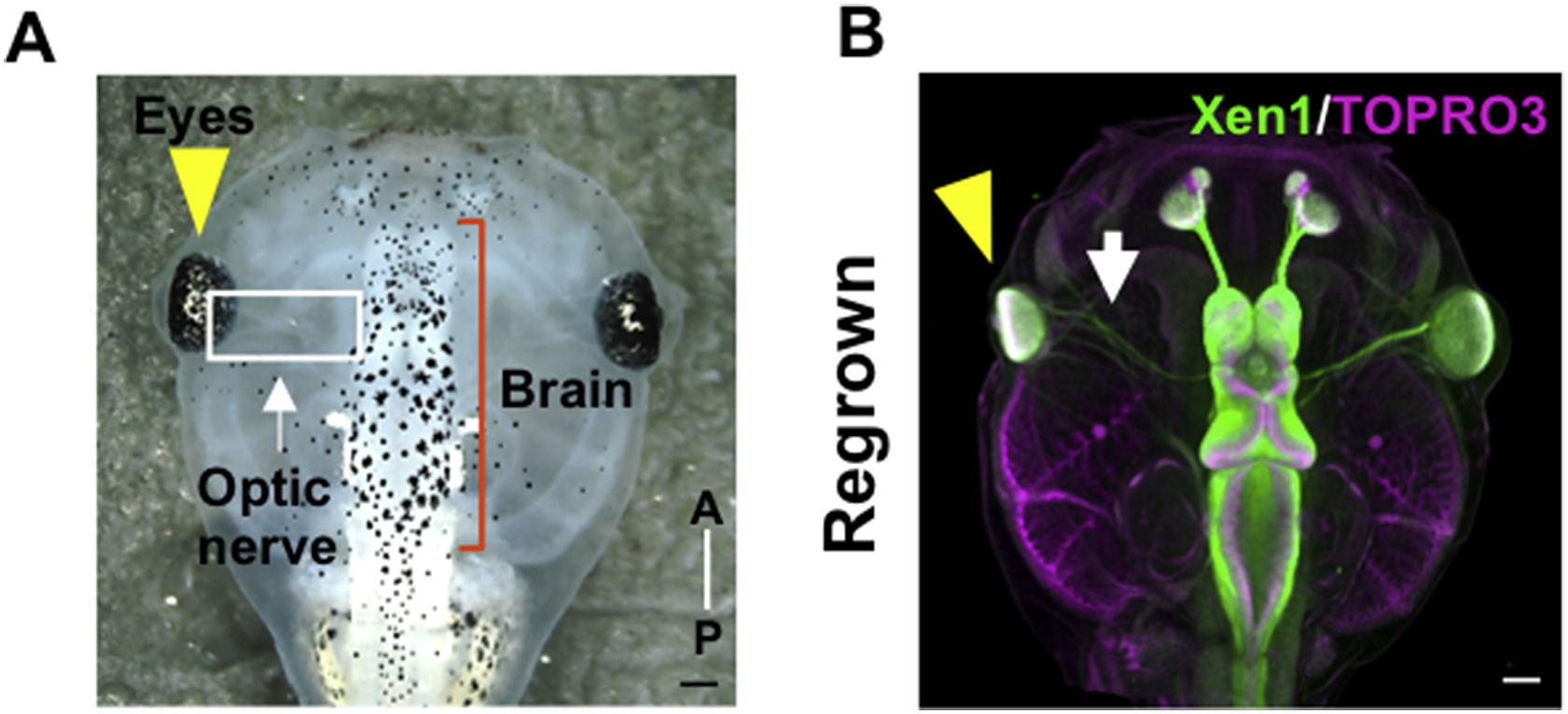 Regrown eye is connected by an optic nerve. (A) A dorsal view of the tadpolehead showing the locations of the eye, optic nerve, and brain. (B) The optic nerve of regrown eye (yellow arrowhead) innervates to the brain, similar to the contralateral, unoperated side. White arrow shows the optic nerve (green) as detected by the Xen1 antibody. Scale bars: A, Bâ¯=â¯250â¯Î¼m.