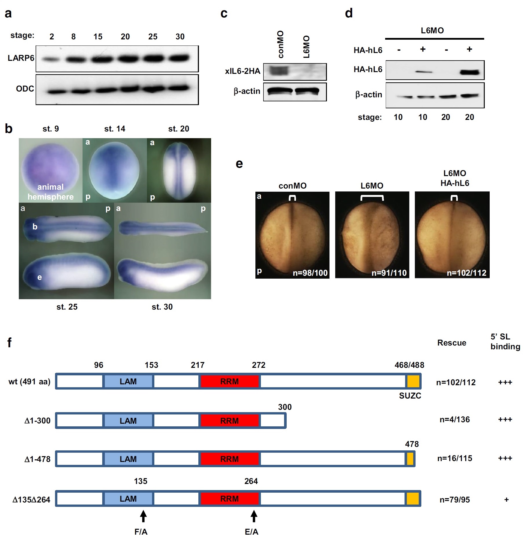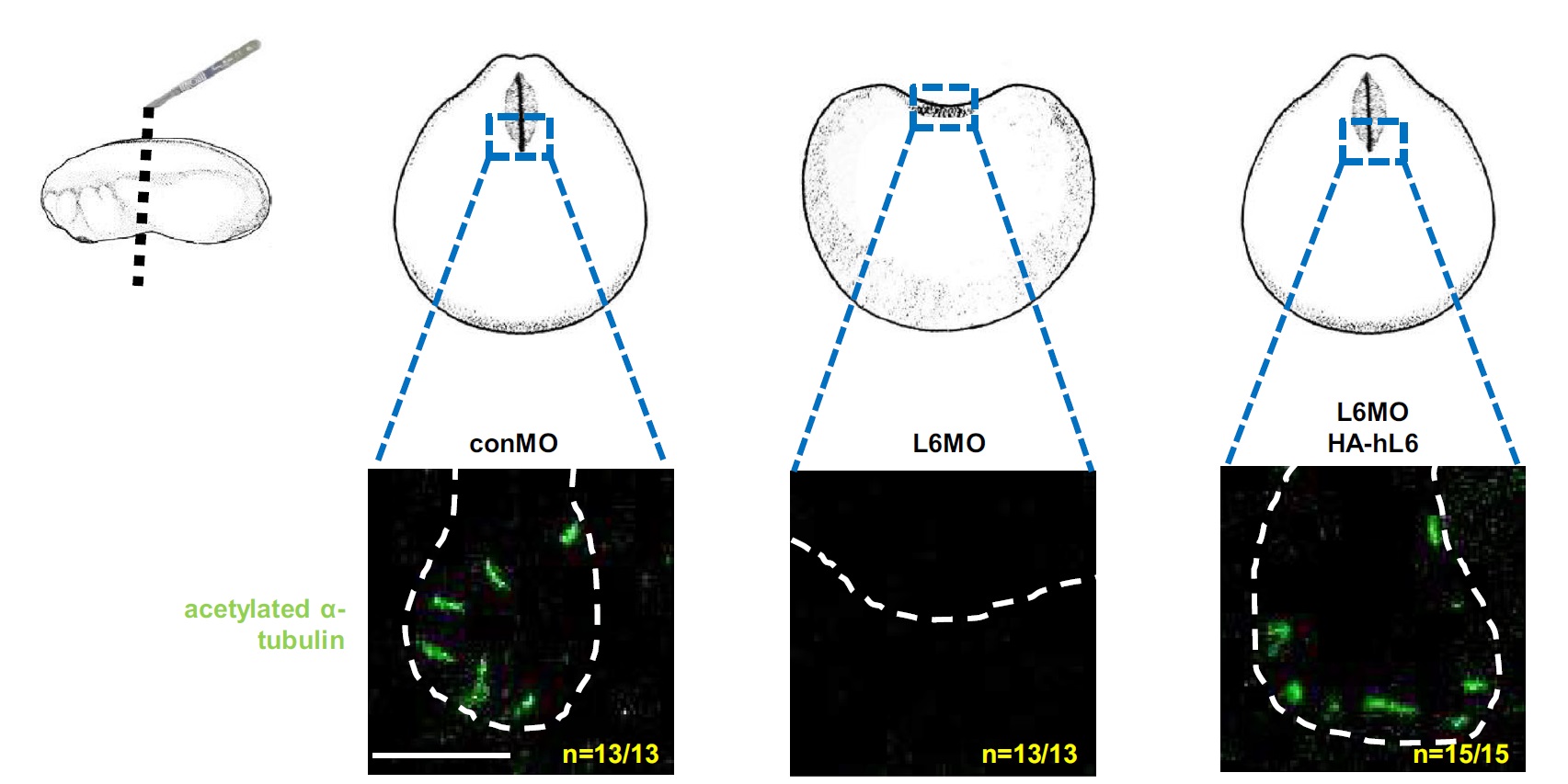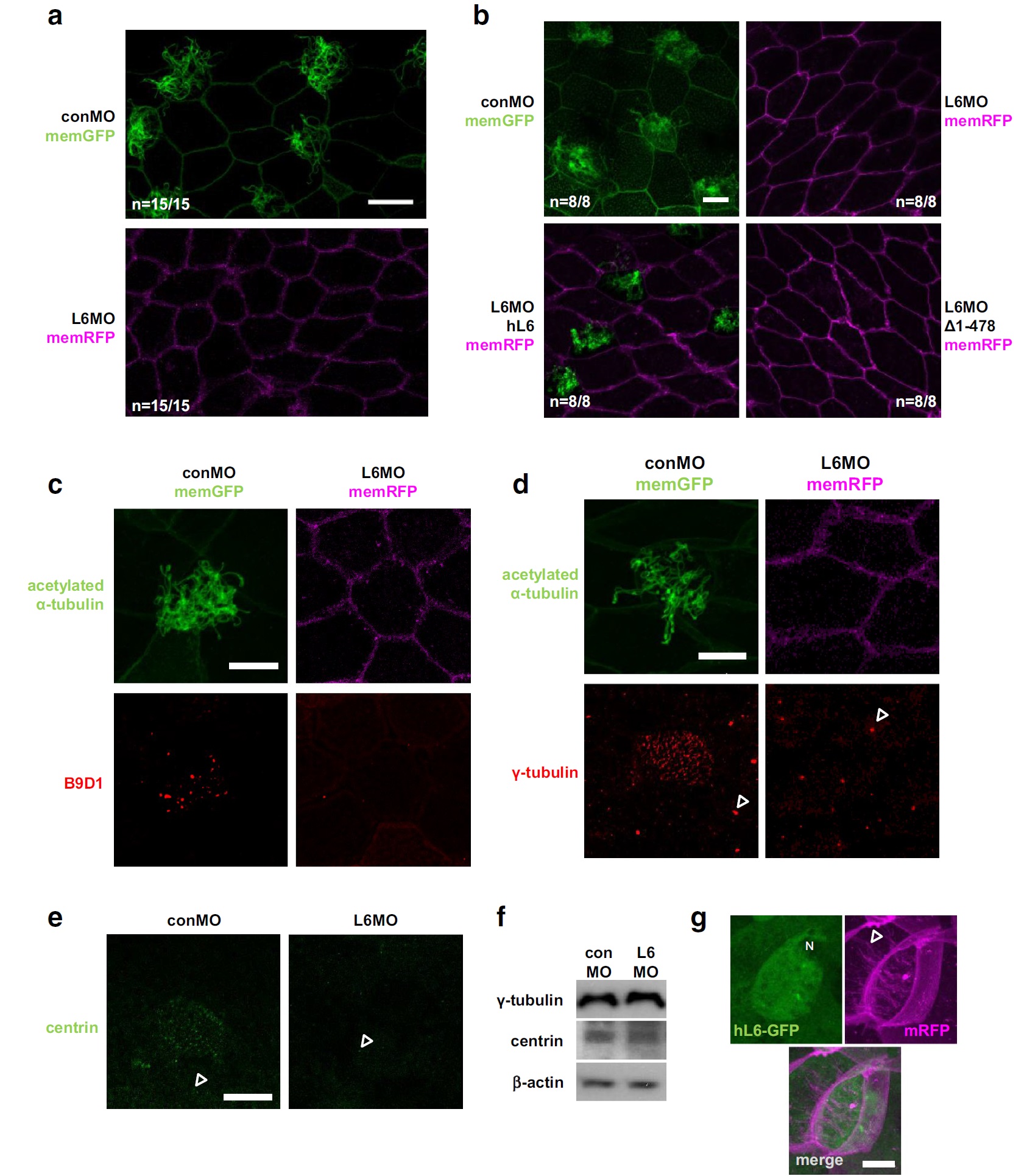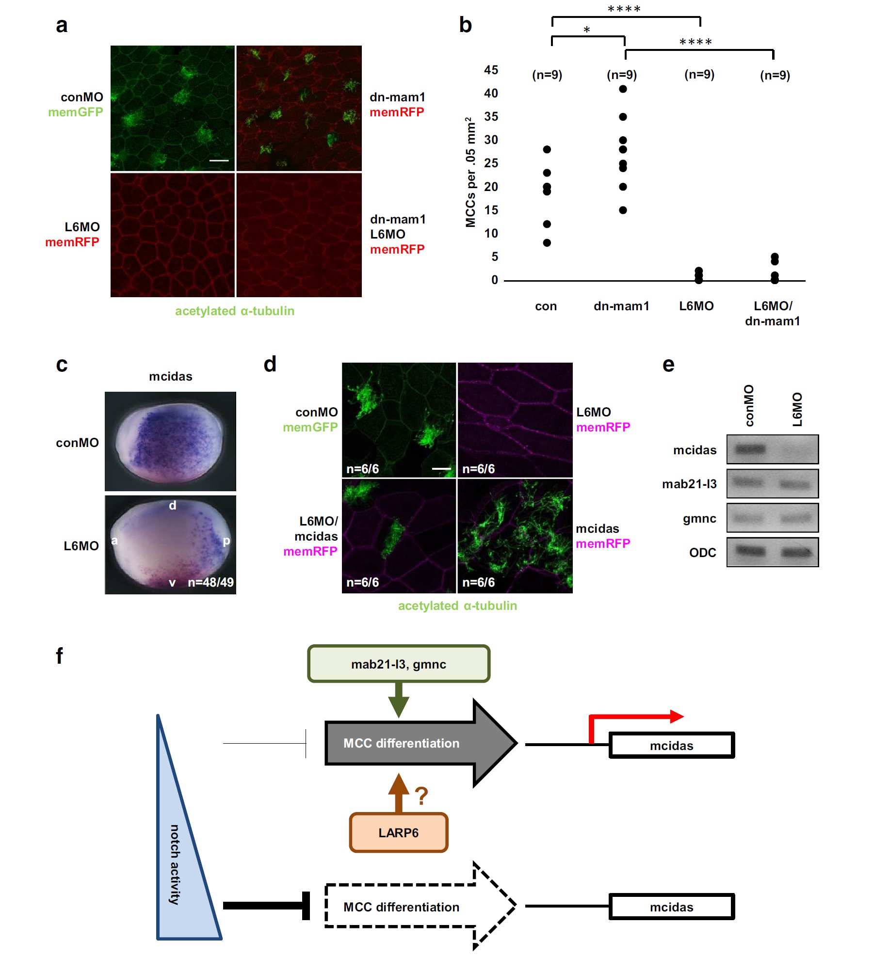 BACKGROUND: La-related protein 6 (LARP6) is an evolutionally conserved RNA-binding protein. Vertebrate LARP6 binds the 5' stem-loop found in mRNAs encoding type I collagen to regulate their translation, but other target mRNAs and additional functions for LARP6 are unknown. The aim of this study was to elucidate an additional function of LARP6 and to evaluate the importance of its function during development. METHODS: To uncover the role of LARP6 in development, we utilized Morpholino Oligos to deplete LARP6 protein in Xenopus embryos. Then, embryonic phenotypes and ciliary structures of LAPR6 morphants were examined. To identify the molecular mechanism underlying ciliogenesis regulated by LARP6, we tested the expression level of cilia-related genes, which play important roles in ciliogenesis, by RT-PCR or whole mount in situ hybridization (WISH). RESULTS: We knocked down LARP6 in Xenopus embryos and found neural tube closure defects. LARP6 mutant, which compromises the collagen synthesis, could rescue these defects. Neural tube closure defects are coincident with lack of cilia, antenna-like cellular organelles with motility- or sensory-related functions, in the neural tube. The absence of cilia at the epidermis was also observed in LARP6 morphants, and this defect was due to the absence of basal bodies which are formed from centrioles and required for ciliary assembly. In the process of multi-ciliated cell (MCC) differentiation, mcidas, which activates the transcription of genes required for centriole formation during ciliogenesis, could partially restore MCCs in LARP6 morphants. In addition, LARP6 likely controls the expression of mcidas in a Notch-independent manner. CONCLUSIONS: La-related protein 6 is involved in ciliated cell differentiation during development by controlling the expression of cilia-related genes including mcidas. This LARP6 function involves a mechanism that is distinct from its established role in binding to collagen mRNAs and regulating their translation.