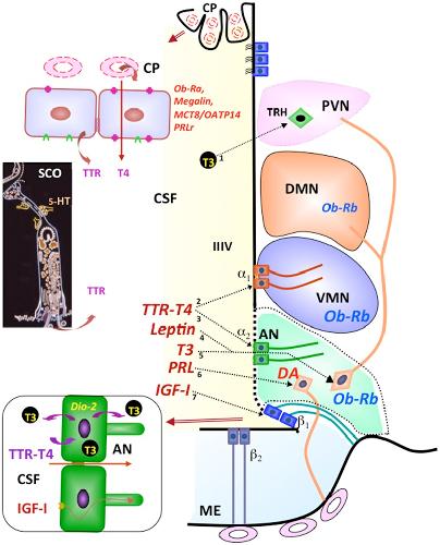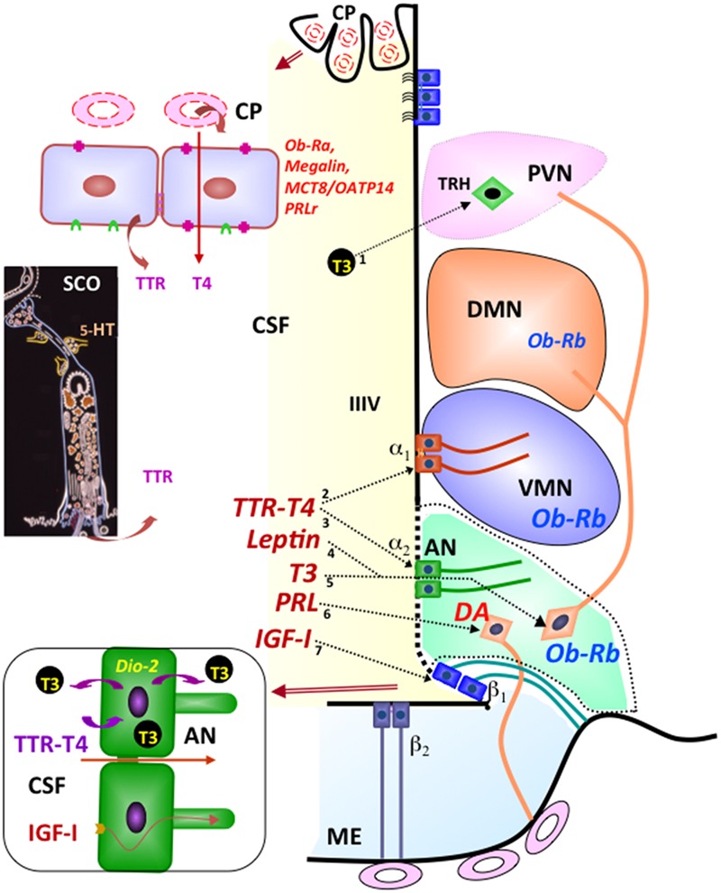 FIGURE 1. Integrative pathways involving the CSF. By receptor mediated transport at the choroid plexus (CP), leptin (Ob-Ra), insulin growth factor I (megalin), thyroid hormones (MCT8/OATP14), and prolactin (PRLr) are transported from blood to CSF. Transthyretin (TTR) is secreted by choroid plexus and the subcommissural organ (SCO) into the CSF. The secretory activity of the SCO is under serotonin (5-HT) inhibitory control. Most CSF T4 is bound to TTR. TTR-T4 complexes are taken up by tanycytes that express deiodinase 2 (arrows 2, 3). Here (bottom left panel), T4 is converted to T3 and then released into the intercellular space of the arcuate nucleus (arrow 5) or into the CSF to reach the TRH-parvocellular neurons of the paraventricular nucleus (arrow 1). The milieu of the arcuate nucleus (AN; green background) is especially exposed to molecules present in the CSF and closed to the median eminence (ME) and ventromedial nucleus (VMN). Leptin present in the CSF may readily reach the neurons expressing the Ob-Rh receptor of the arcuate (arrow 4), ventromedial and dorsomedial nuclei of the hypothalamus. CSF prolactin (arrow 6) may reach the dopamine-secreting neurons (DA) of the arcuate nucleus that project to the portal capillaries of the median eminence (light-blue background). CSF insulin growth factor I (arrow 7) is internalized by β tanycytes and transported along their processes. Modified after Rodríguez et al. (2010). |