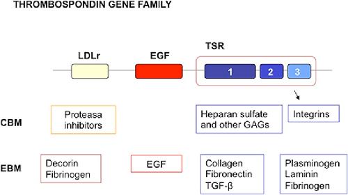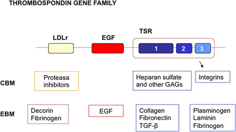 FIGURE 5. Multidomain organization of thrombosponin type 1 molecules. LDL receptor domains are indicated by the yellow box. EGF like domains are indicated by the red box. Thrombospondin types 1, 2, and 3 repeats (TSRs) are indicated by the blue boxes. A number of cellular and extracellular binding molecules for the domains have been identified. Many of these are components of ECM. CBM, cellular binding molecules; EBM, extracellular binding molecules. |