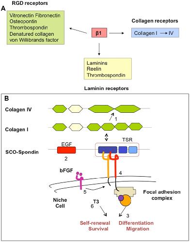 Bamdad, Alpha1beta1-integrin is an essential signal for neurite outgrowth induced by thrombospondin type 1 repeats of SCO-spondin. 2004, Pubmed