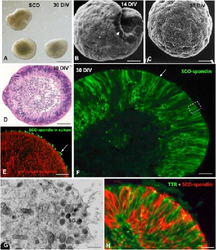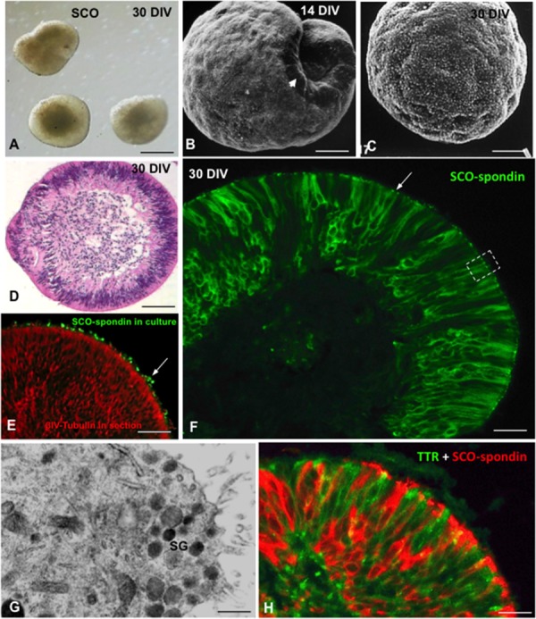 FIGURE 7. Organ culture of bovine subcommissural organ. After 30 days in culture, SCO explants organize forming spheres of secretory ependymocytes. (A) Phase contrast microscopy. (B,C) Scanning electron microscopy after 14 (B) and 30 DIV (C). (D) Section of a SCO-explant stained with haematoxylin-eosin. (E) Secretory evidence of secretion. Explants were cultured in the presence of antibodies against SCO-spondin. After histological procedure, sections were incubated with anti-IgG conjugated with alexa 488. Immunofluorescence reveals the presence of SCO-spondin aggregates associated to cilia (green, arrow). (F) Section of a SCO-explant immunostained for SCO-spondin showing the intracellular and extracellular (arrow) location of the protein. (G) Ultrathin section of an area similar to that framed in previous figure, showing the ultrastructure of the apical cell pole loaded with secretory granules (sg). (H) Section of a SCO-explant. Double immunofluorescence for SCO-spondin (red) and TTR (green). Scale bars: (A) 60 μm; (B–E) 25 μm; (F) 10 μm; (G) 500 nm; (H) 10 μm. From Schöebitz et al. (2001), Montecinos et al. (2005). |