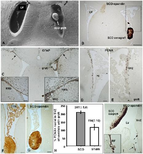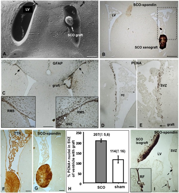 FIGURE 8. Xeno- and isografting of SCO-explants into the lateral ventricle of adult rats. (A–H) Bovine SCO-explants 30 DIV were grafted into the lateral ventricle of adult rats. (A) Scanning electron microscopy showing a SCO-explant in the ventricle. (B) Frontal section of the brain of a grafted animal immunostained with AFRU. The grafted SCO is strongly reactive. The area framed is shown in figures D and E. LV, lateral ventricle. (C) Frontal section of the brain of a grafted animal immunostained for GFAP. Astrocytes forming the rostral migratory stream (RMS) are shown. In the grafted ventricle the RMS is hypertrophied (right inset) as compared to that of the contralateral ventricle (left inside). (D,E) Areas similar to that framed in figure (B), immunostained for PCNA. In the grafted ventricle (E) proliferation is significantly higher than in the contralateral ventricle (D). (F,G) The grafted SCO expresses TTR and SCO-spondin. TTR is also expressed by the choroid plexus. (H) Quantitative analysis of PCNA+ nuclei after SCO grafting in a lateral ventricle of an adult normal rat. The results are expressed as percentage of the number of labeled nuclei in the SVZ of the ventricle carrying the grafts with respect to that of the contralateral ventricle, taken as 100%. Sham operated rats underwent surgery as for transplantation, but received no graft. There is a twofold increase of PCNA+ nuclei in the grafted ventricle. (I) Rat SCO explant grafted into the lateral ventricle of an adult rat. The graft becomes integrated into the wall of the lateral ventricle (LV) with the ependymal cells secreting SCO-spondin into the ventricle aggregated on the ependyma of the subventricular zone (broken arrow; SVZ) and forming a Reissner fiber (RF; full arrow; inset). Scale bars: (A–C) 120 μm; (D,E) 60 μm; (F,G) 40 μm; (I) 60 μm. From Rodríguez et al. (1999); González (2007). |
