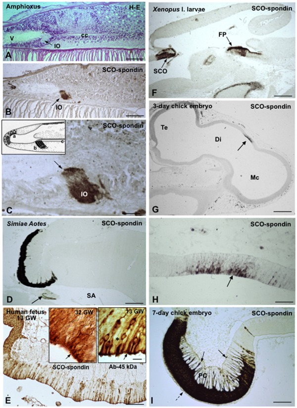FIGURE 2. The subcommissural organ is the phylogenetically oldest brain gland and the first to differentiate in ontogeny. (AâE) From amphioxus to primates, 500 million years of evolution. (AâC) Sagittal sections through the CNS of the amphioxus (Branchiostoma lanceolatum, Acrania), showing the location (A) and immunoreactivity (B,C) of the cells forming the Infundibular organ (IO). V, ventricle; cc, central canal; from Olsson et al. (1994). (C) Line drawing of the CNS of the amphioxus showing a secretory ependyma in the recessus neuroporicus (a), the infundibular organ (b) and the central canal with Reissner fiber (c); from Olsson and Wingstrand (1954). (D) Subcommissural organ and Reissner fiber (arrow) of the primate Aotes. SA, sylvius aqueduct; from RodrÃguez et al. (1993). (E) Sagittal section through the epithalamus of a 13-weeks-old human fetus immunostained with an antiserum against a 45 kDa compound (most likely corresponding to TTR) obtained from the CSF of a hydrocephalic fetus. A population of ependymocytes are strongly immunoreactive; from RodrÃguez et al. (1993). Right inset detailed magnification of previous figure showing immunoreactive (arrow) and immunonegative (asterisk) ependymal cells; left inset SCO from a 32 GW fetus immunostained for SCO-spondin; all cells are immunoreactive (arrow). (F) Sagittal section through the CNS of a Xenopus l larvae. The cells of the subcommissural organ (SCO) and the floor plate (FP) strongly express SCO-spondin. (G) Sagittal section through the CNS of a 3-days-old chick embryo. A small group of neuroependymal cells located a the roof of the diencephalic vesicle (Di) expresses SCO-spondin (arrow). Te, telencephalon; Mc, mesencephalon. (H) Detailed view of previous figure showing that SCO-spondin is mainly located in the apical region of the neuroependymal cells (arrow). (i) At the 7th day of incubation, the chick SCO is fully differentiated with SCO-spondin located in the cell body of ependymocytes (broken arrow) and along their basal processes ending at the pial membrane (full arrows). PC, posterior commissure; from Schoebitz et al. (1986). Scale bars: (A,B) 80 μm; (C) 16 μm; (D) 400 μm; (E) 100 μm; right Inset 9 μm; left inset 8 μm; (F) 300 μm; (G) 280 μm; (H) 56 μm; (I) 85 μm. |