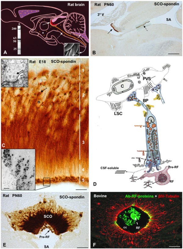 FIGURE 3. The subcommissural organ-Reissner fiber complex. (A) Drawing depicting the rat subcommissural organ (red, full arrow)- Reissner fiber (orange, broken arrow) complex and the CSF-soluble secretion (orange dots, asterisk). (Right inset) Scanning electron microscopy of bovine RF collected from the central canal. Left inset. Western blot of CSF of PN30 rats, immunoreacted with antibodies against SCO-spondin. CSF-soluble compounds of 200, 63, 50, and 25 kDa of molecular weight are shown. (B) Sagittal section of a rat brain immunostained with anti-SCO-spondin at postnatal day 60. The SCO (full arrow)-RF (broken arrow) complex is selectively immunoreactive. (C) High magnification of the SCO of a rat embryo (E18) immunostained with anti-SCO-spondin. Zonation of a SCO-cell (1–5) is shown. Arrow points to paranuclear immunoreactive masses corresponding to RER. Upper inset. Electron microscopy of dilated RER cisternae (arrow). Lower inset. Electron microscopy immunocytochemistry using anti-SCO spondin showing secretory granules stored at the apical cell pole. (D) Drawing depicting the ultrastructure and the secretory process of a SCO-ependymal cell. They are bipolar cells, with and apical pole contacting the ventricular CSF and a basal process projecting to local capillaries and to the subarachnoid space. Glycoproteins secreted by the SCO cells either remain soluble into CSF or polymerize forming the RF. The secretory material upon release condenses, first as a film on the surface of the organ (pre-RF) and, after further packaging, into RF. The basal processes of ependymal cells (BP) receive abundant serotonergic, gabaergic, and catecholaminergic neural inputs and end on a network of basal lamina containing long spacing collagen (LSC). PVS, perivascular space. (E) Frontal section of a rat brain at PN60 immunostained with anti-SCO-spondin. SCO and pre-RF are strongly reactive. (F) Frontal section of the bovine spinal cord processed for double immunofluorescence using anti-RF proteins (green) and βIV-tubulin (red). The central canal (cc) contains Reissner fiber (RF, green) and is lined by tanycytes-like ependymal cells (red). Scale bars: (B) 200 μm; (C) 10 μm; (E) 40 nm; (F) 20 μm. From Rodríguez et al. (1993); Vío et al. (2008), Ortloff et al. (2013). |